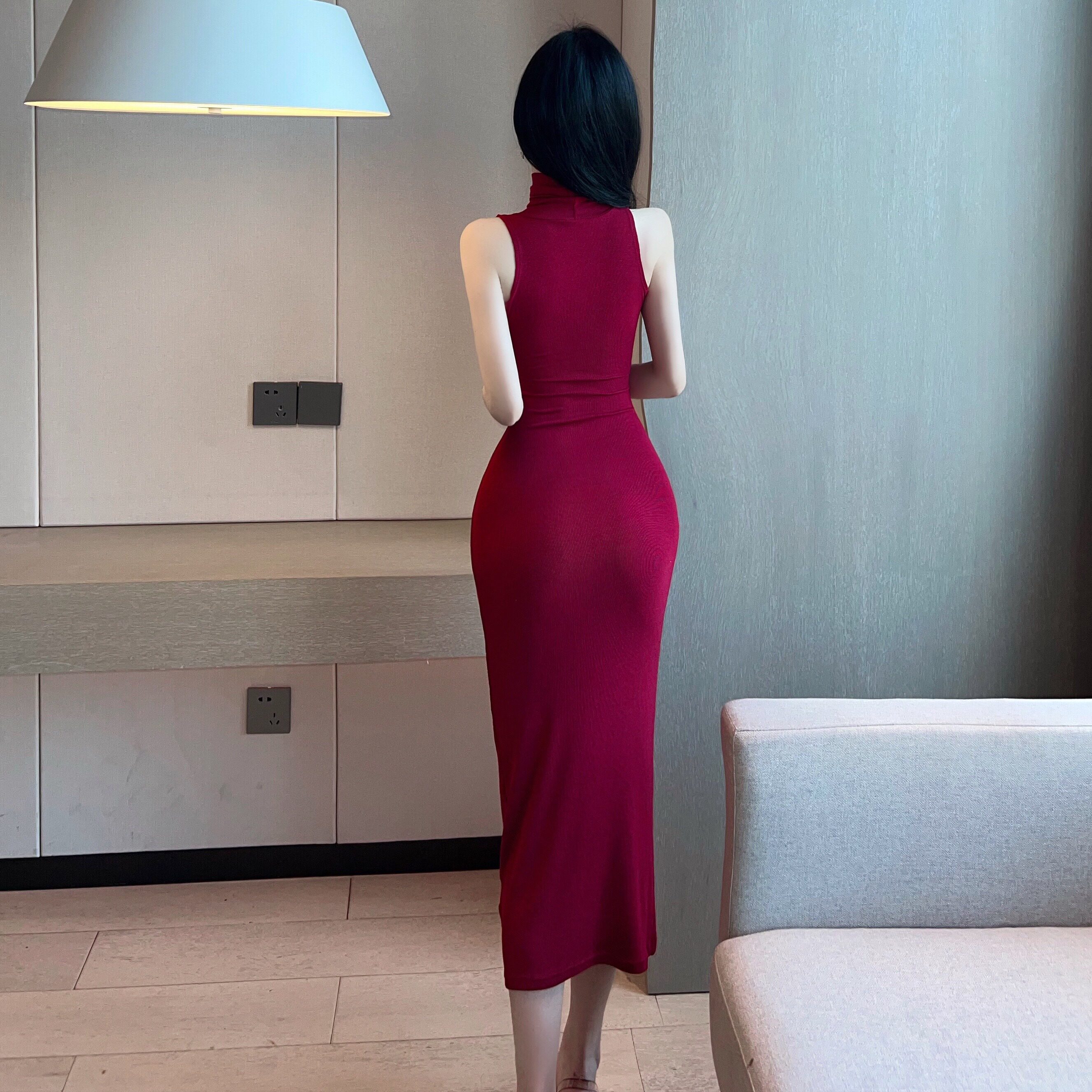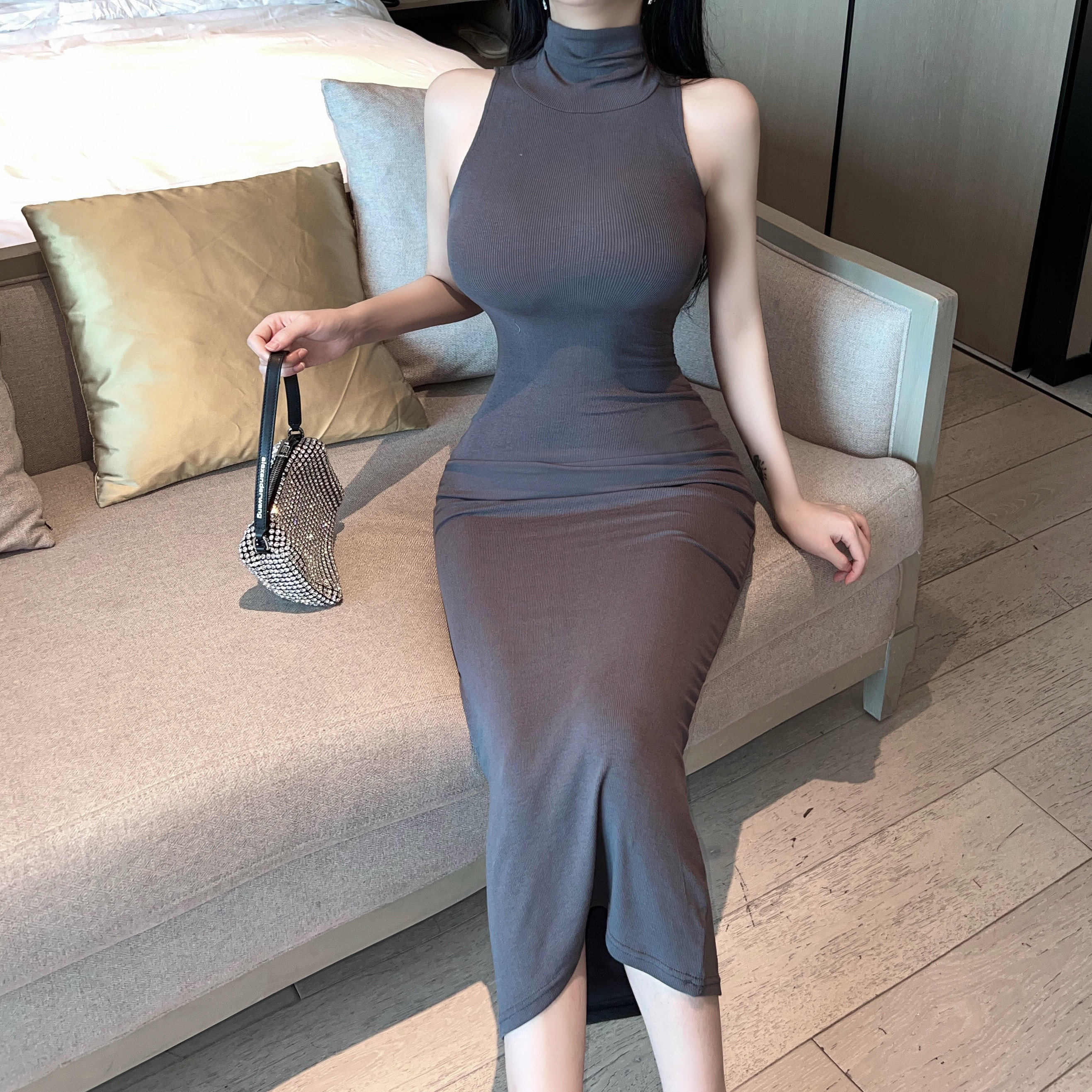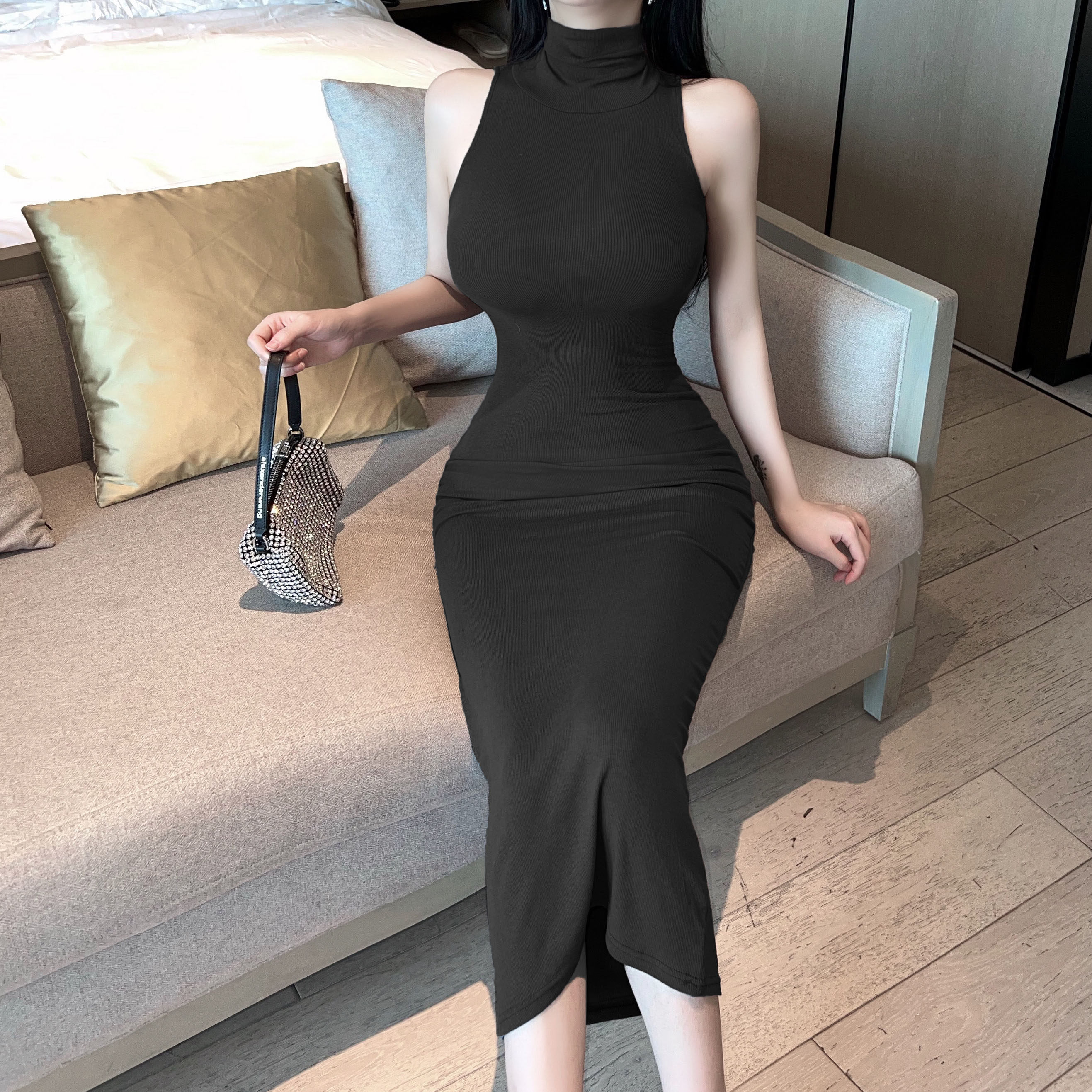 春夏韩国东大门时尚高领紧身显瘦无袖包臀打底背心针织连衣裙长裙