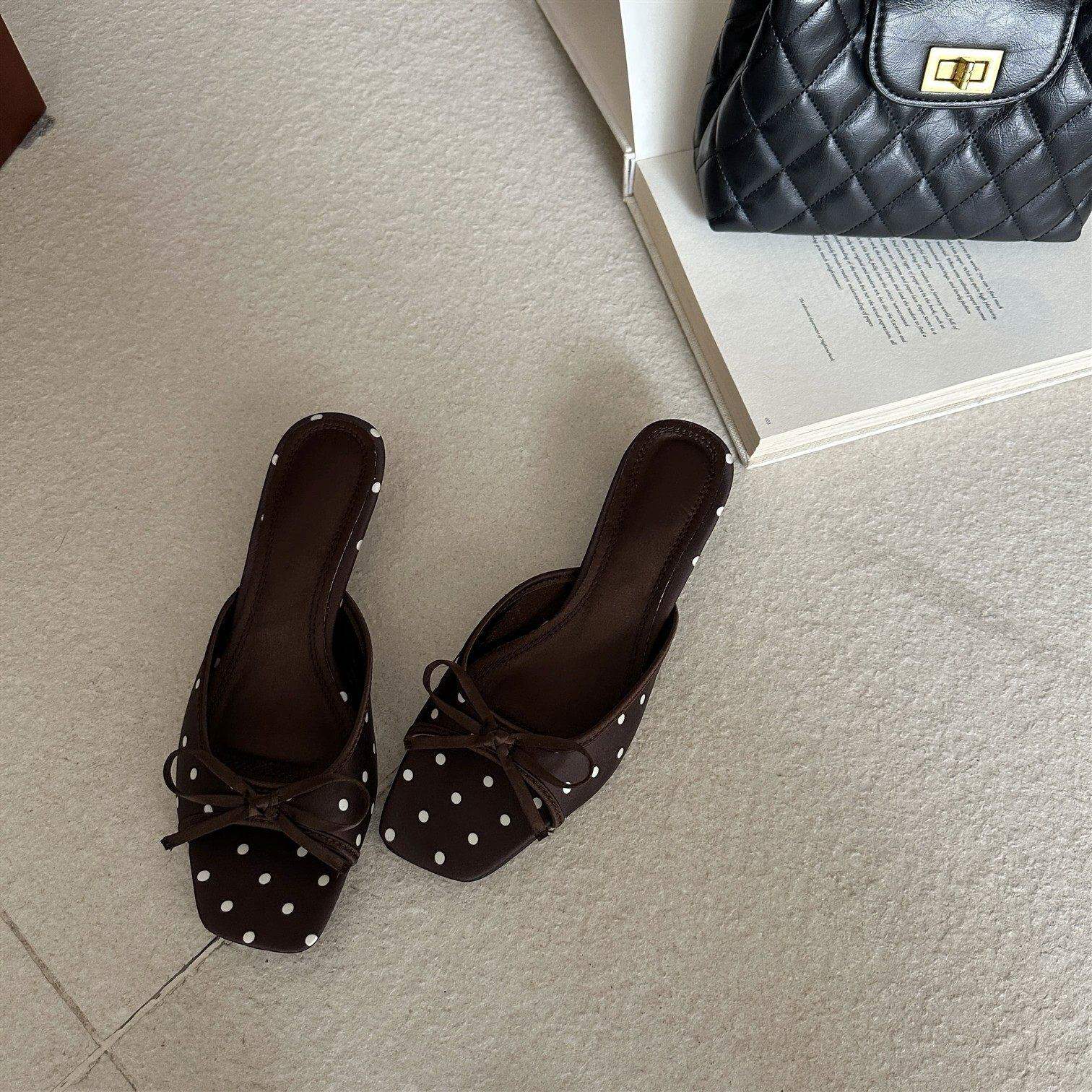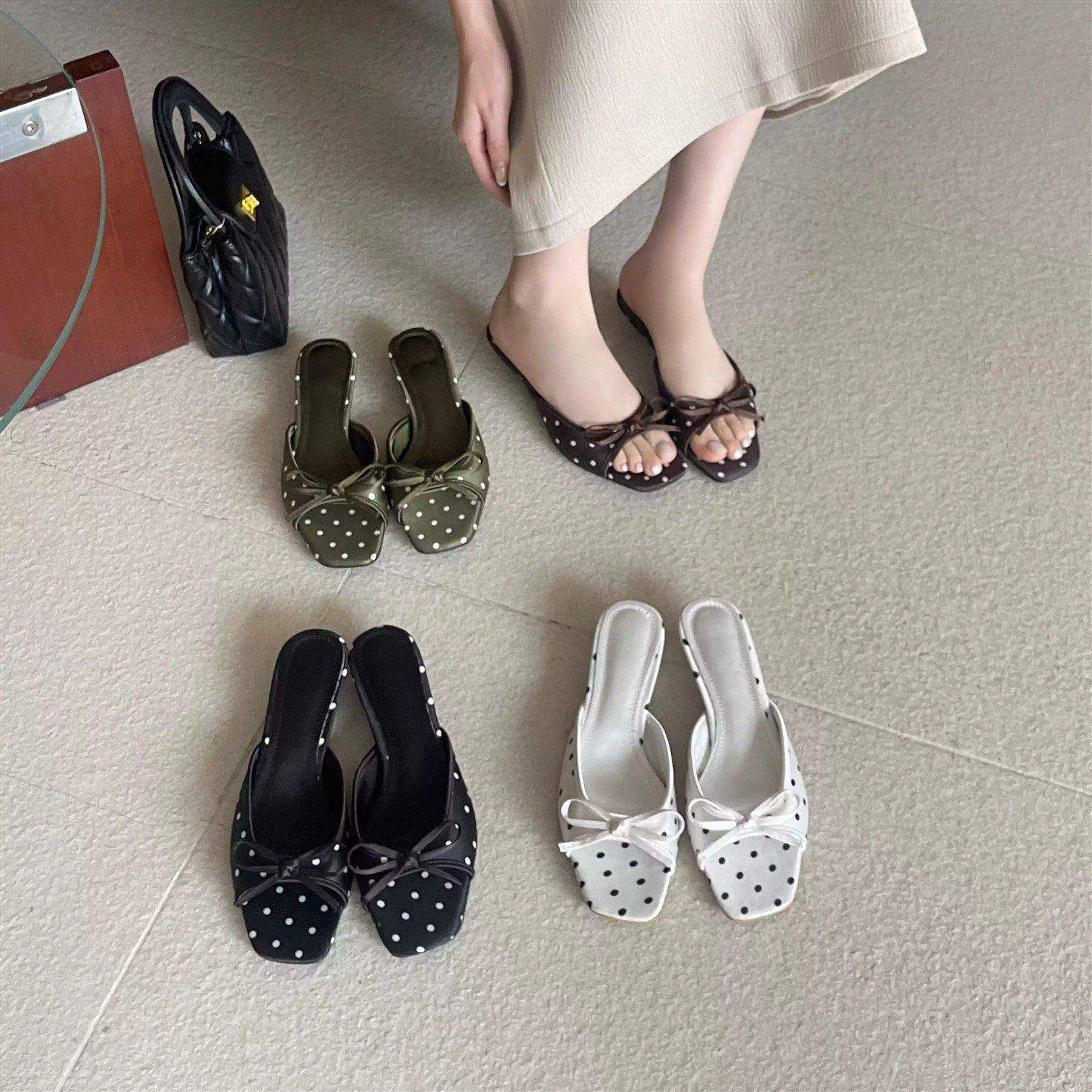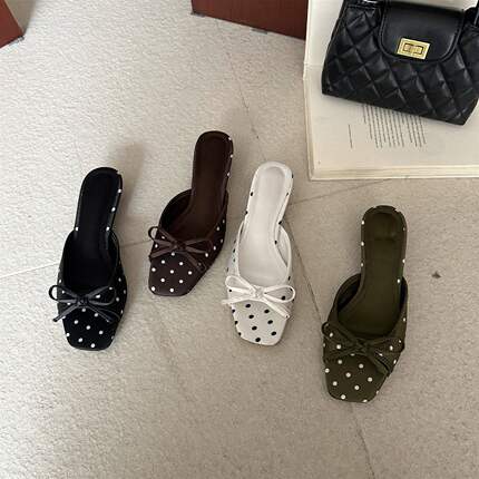 法式波点蝴蝶结包头拖鞋女外穿粗跟增高懒人鞋半包拖
