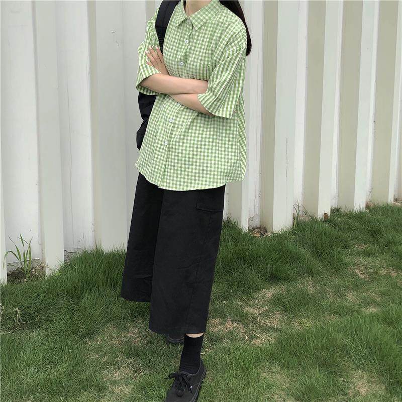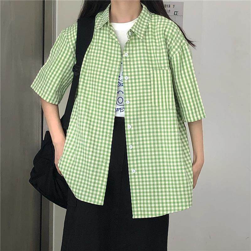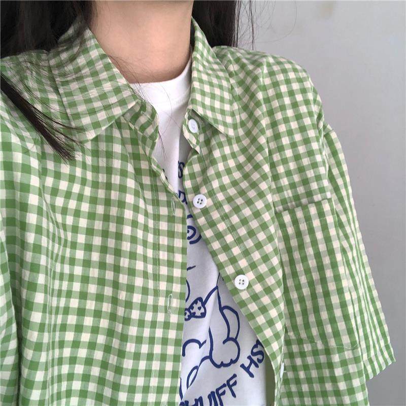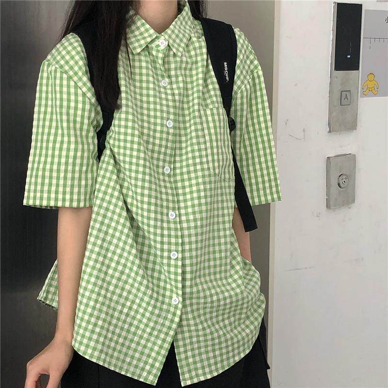 衬衫女夏短袖衬衣宽松韩版百搭设计感小众清新绿色格子上衣ins潮