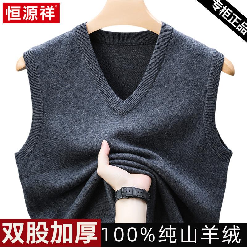 恒源祥男士羊绒背心秋冬季加厚纯色V领针织马甲休闲无袖坎肩毛衣