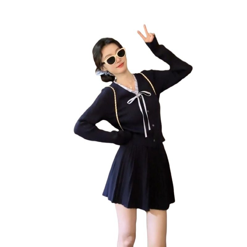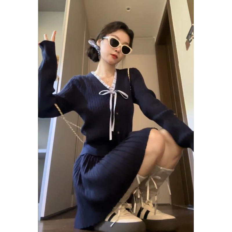 大码女装韩系甜美蝴蝶结针织开衫显瘦百褶裙两件套秋冬季百搭套装