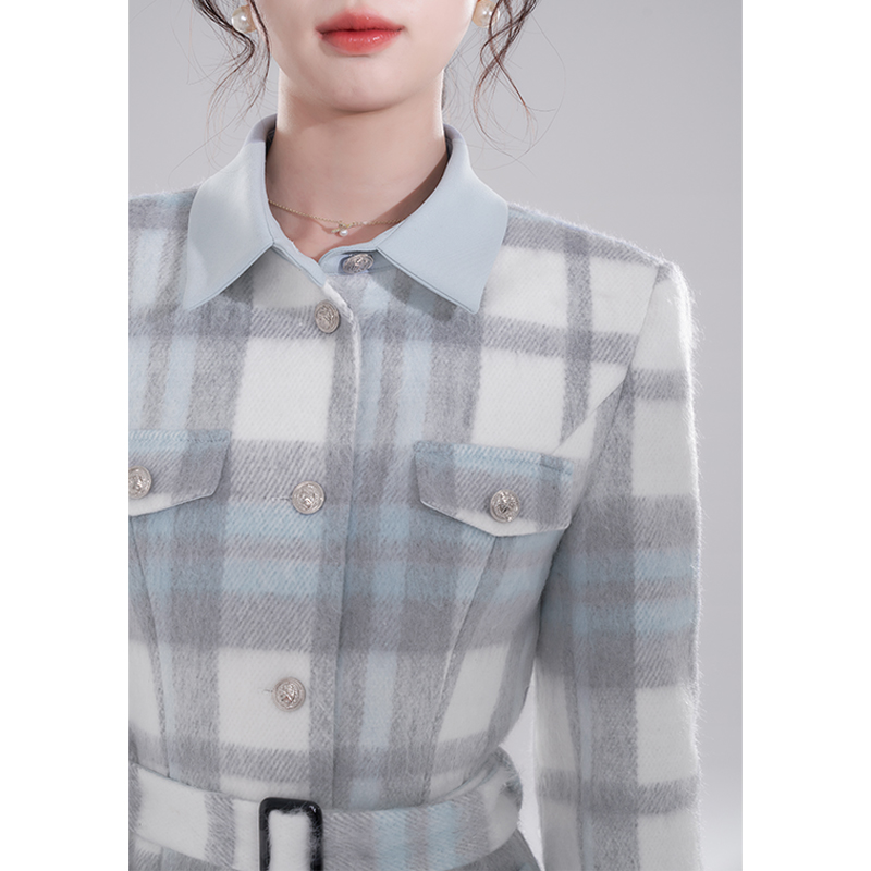 蓝色格子毛呢外套女加厚秋冬季2023新款气质学院风中长款呢子大衣