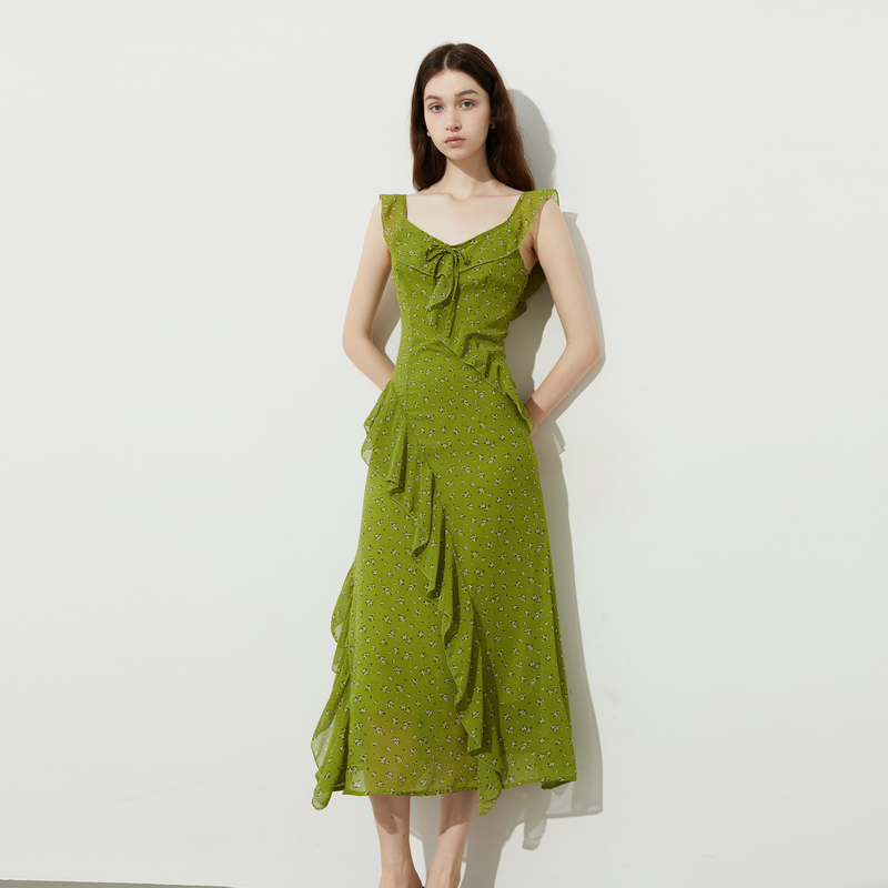 DPLAY2025年夏季新款绿色印花飞飞袖长裙V领荷叶边露背连衣裙女