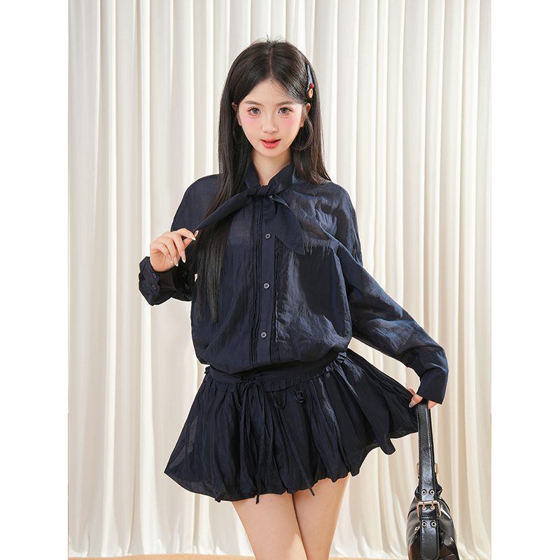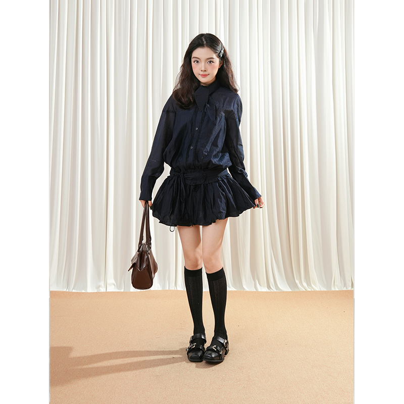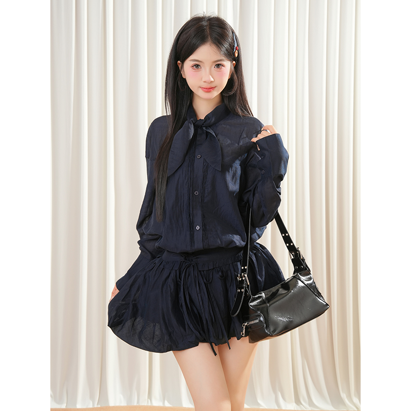 法式设计感深蓝色长袖衬衫连衣裙2025秋季新款收腰显瘦仙女短裙