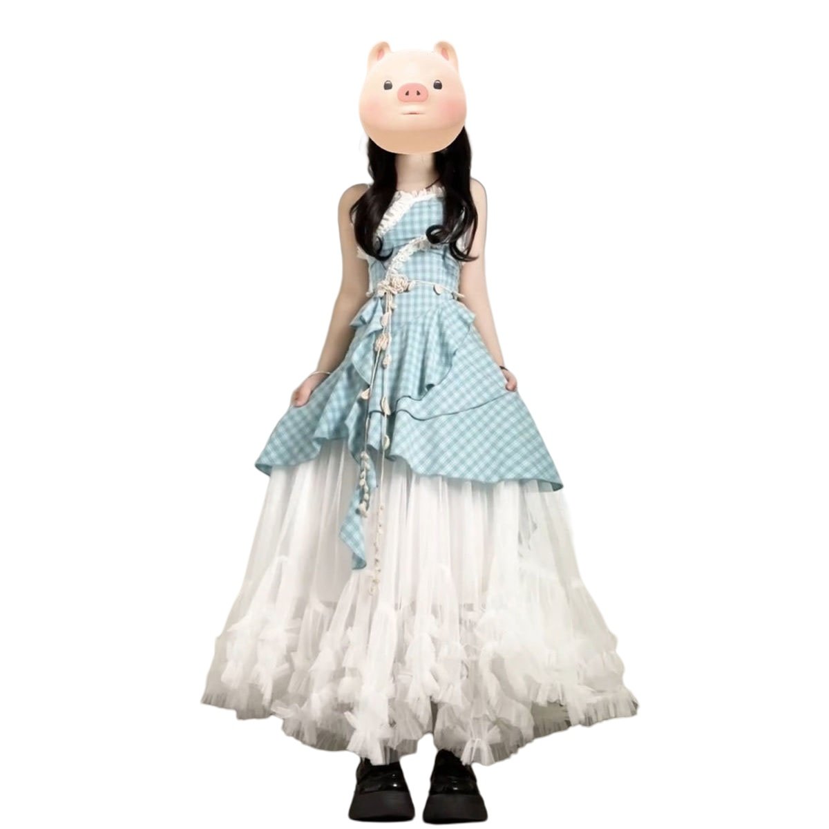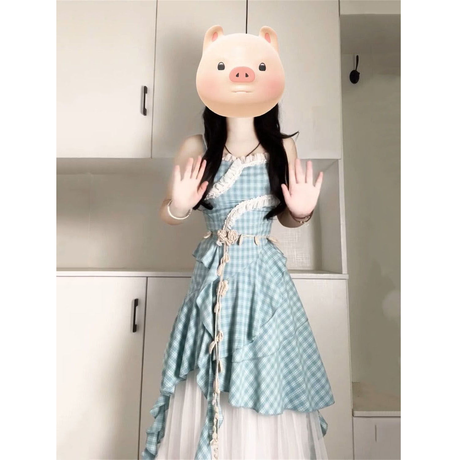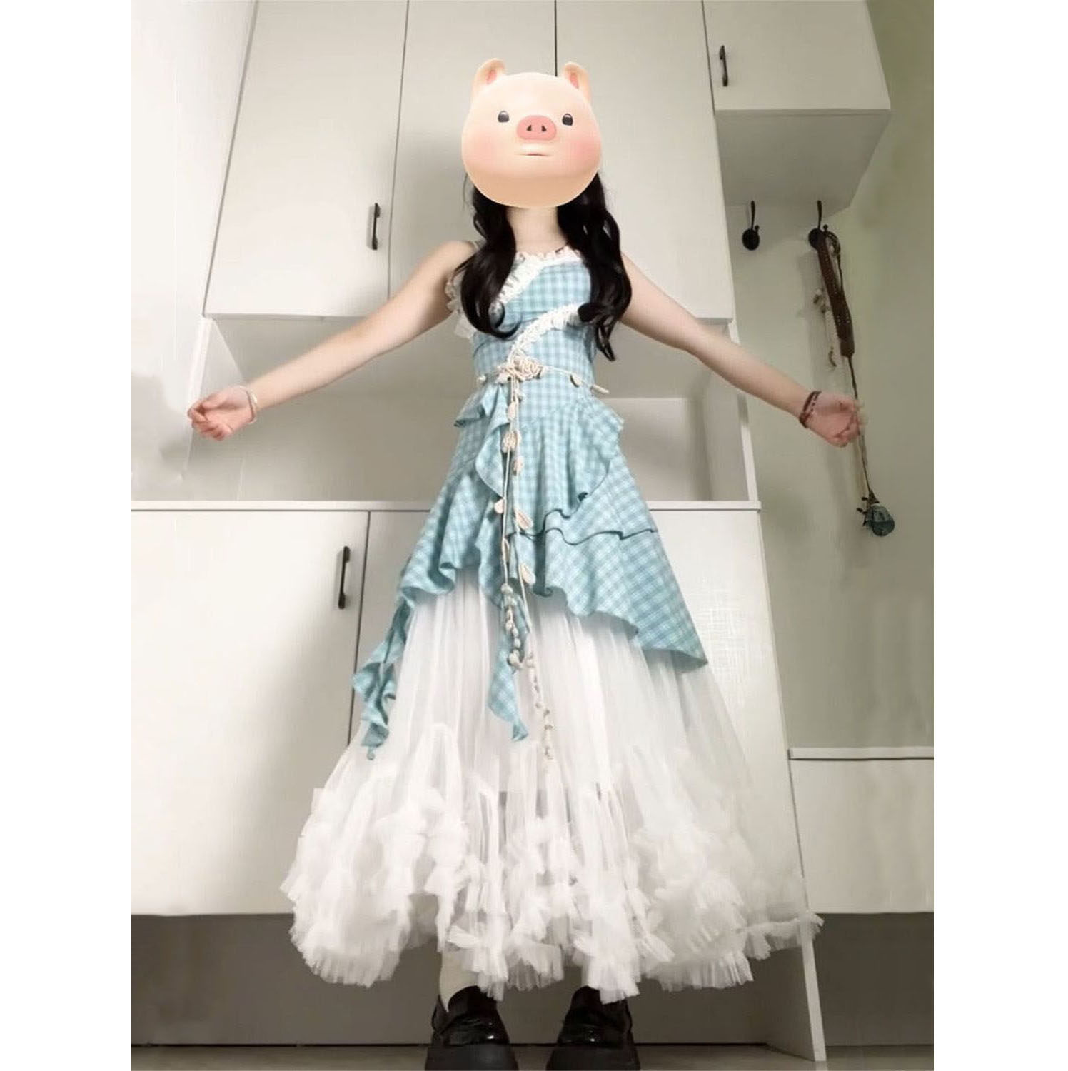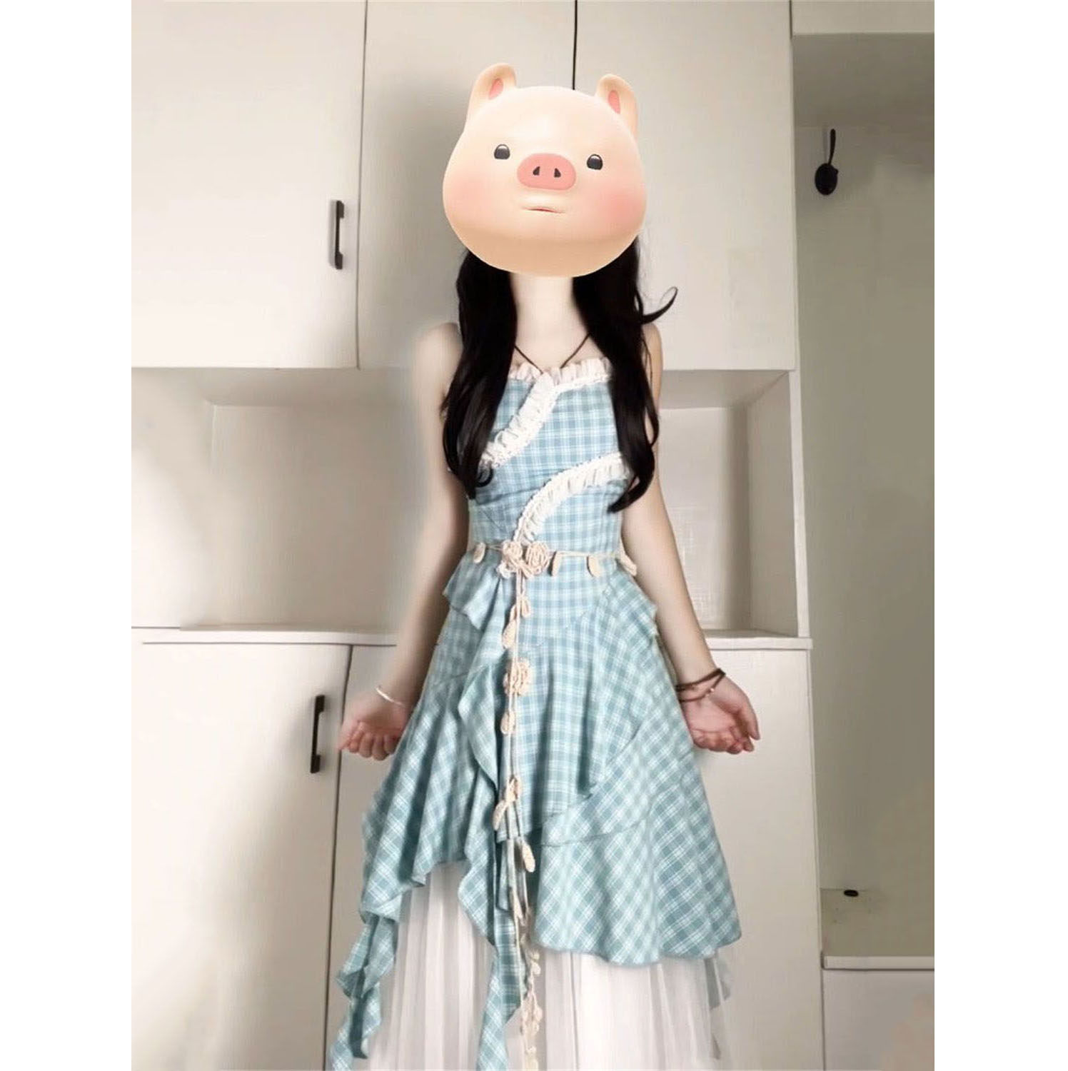 夏季韩系学院风不规则设计感吊带连衣裙女学生搭配蕾丝拼接半身裙
