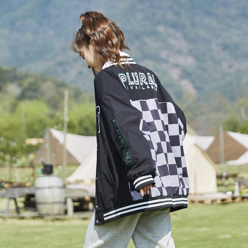 唐狮休闲棒球服女春秋新款拼接上衣棋盘格设计感小众短外套