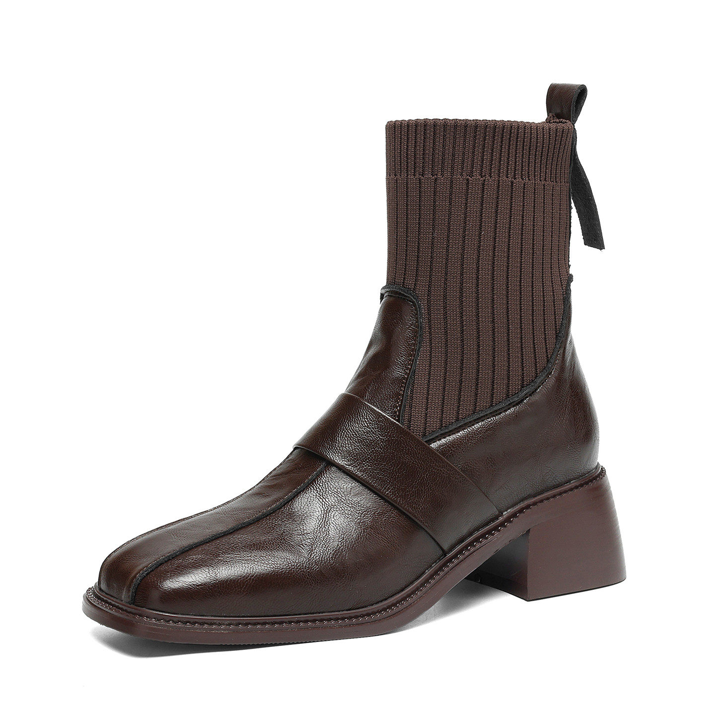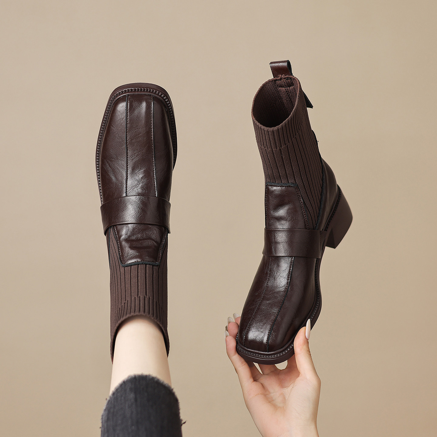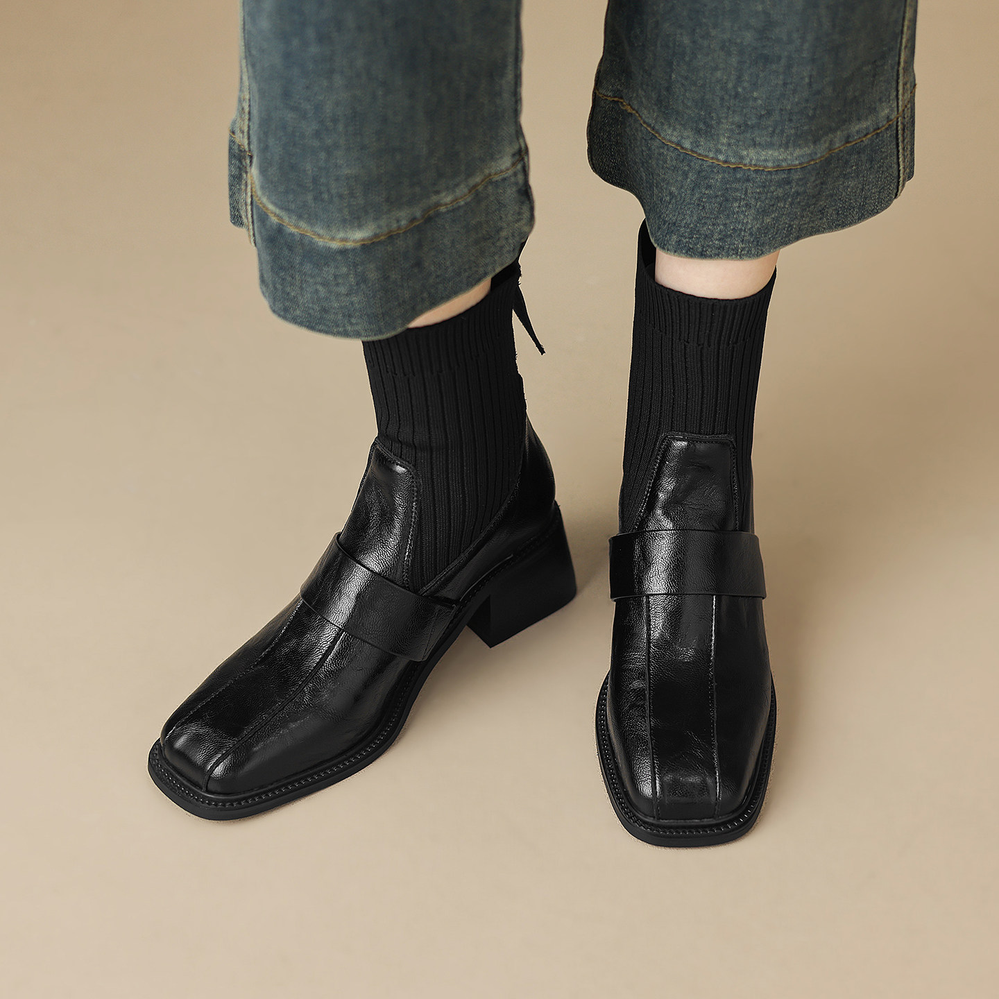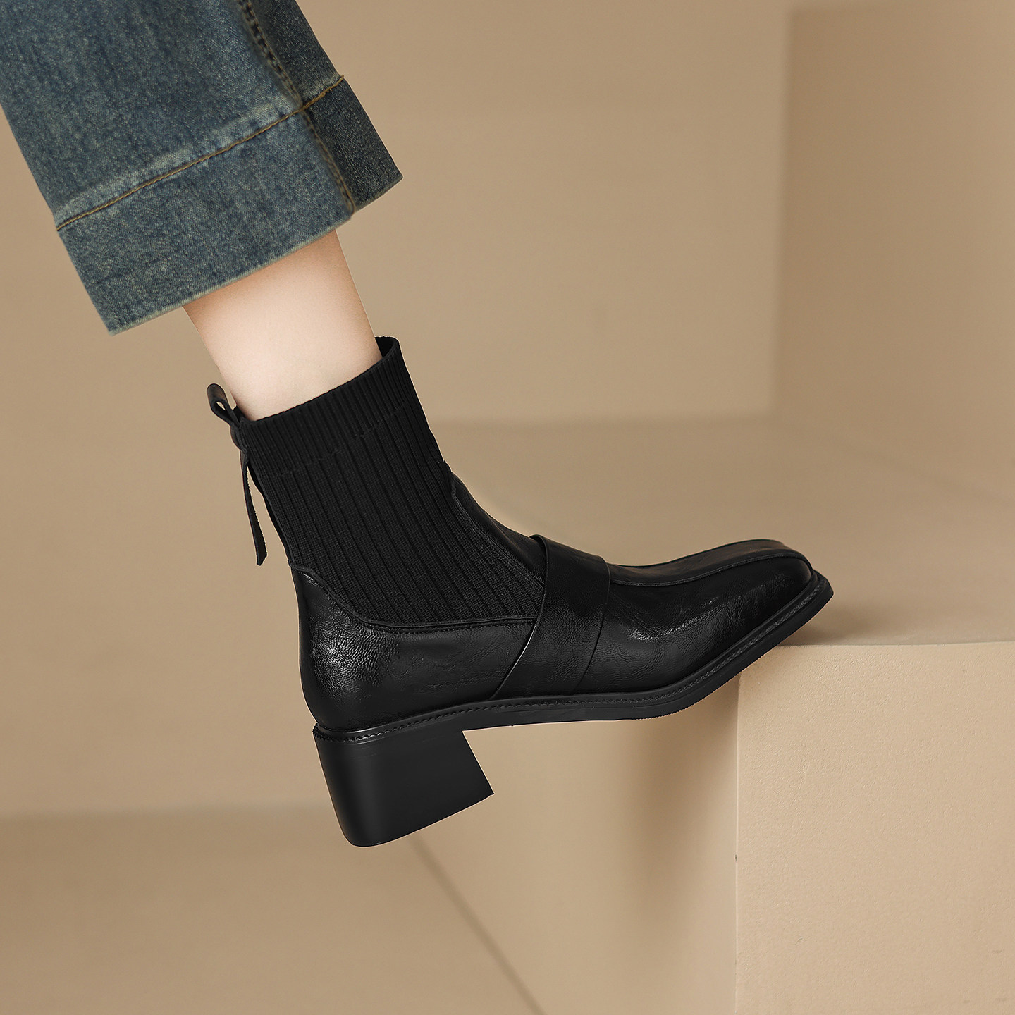 粗高跟袜子拼接弹力瘦瘦单靴女