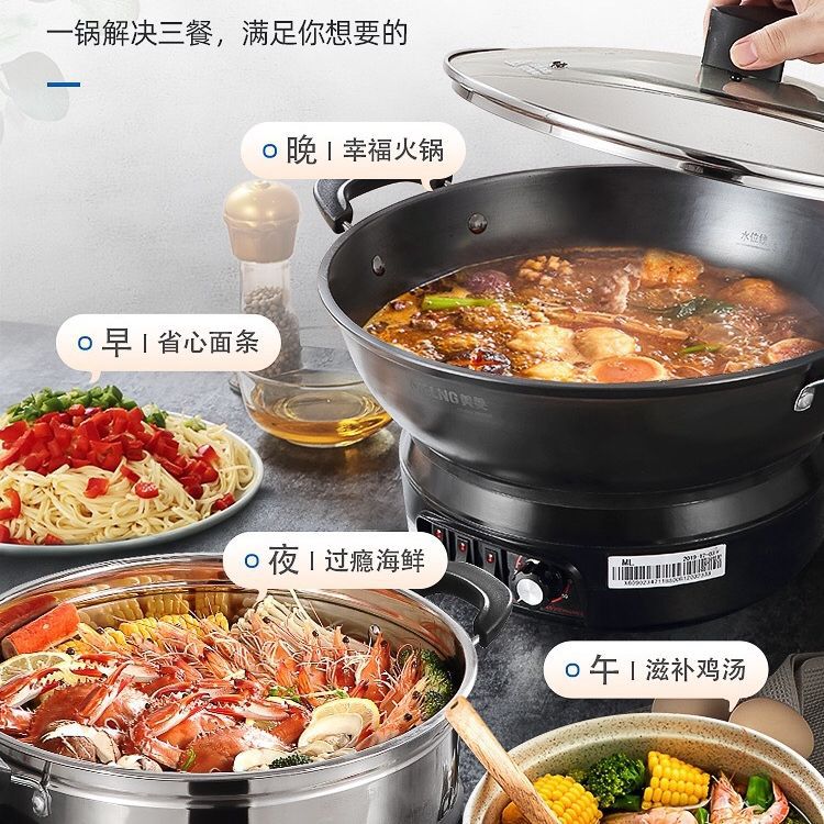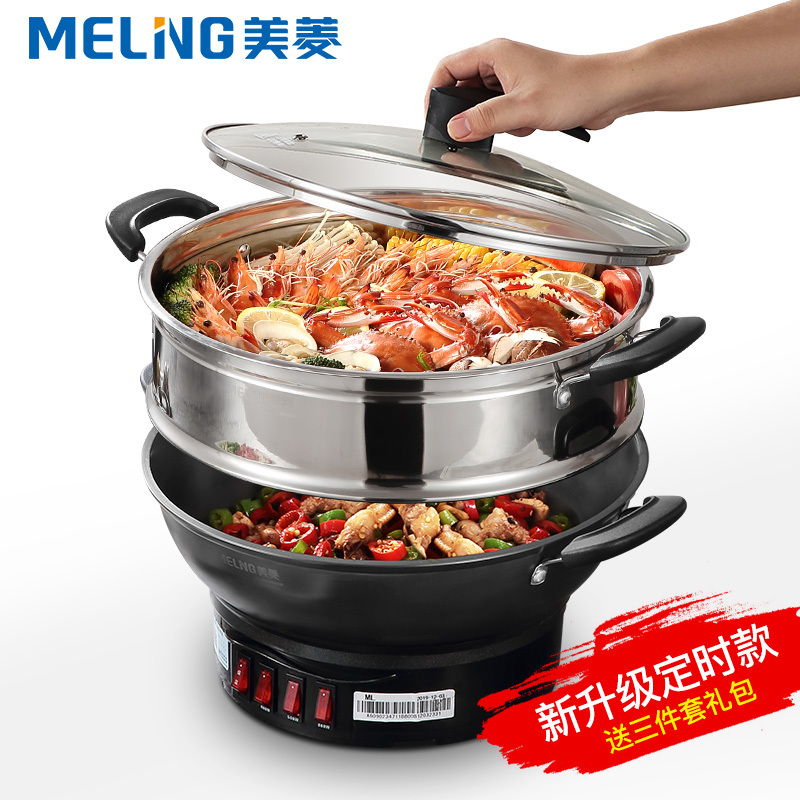 美菱电炒锅大容量定时蒸锅家用多功能电热火锅铸铁炒锅蒸煮一体锅