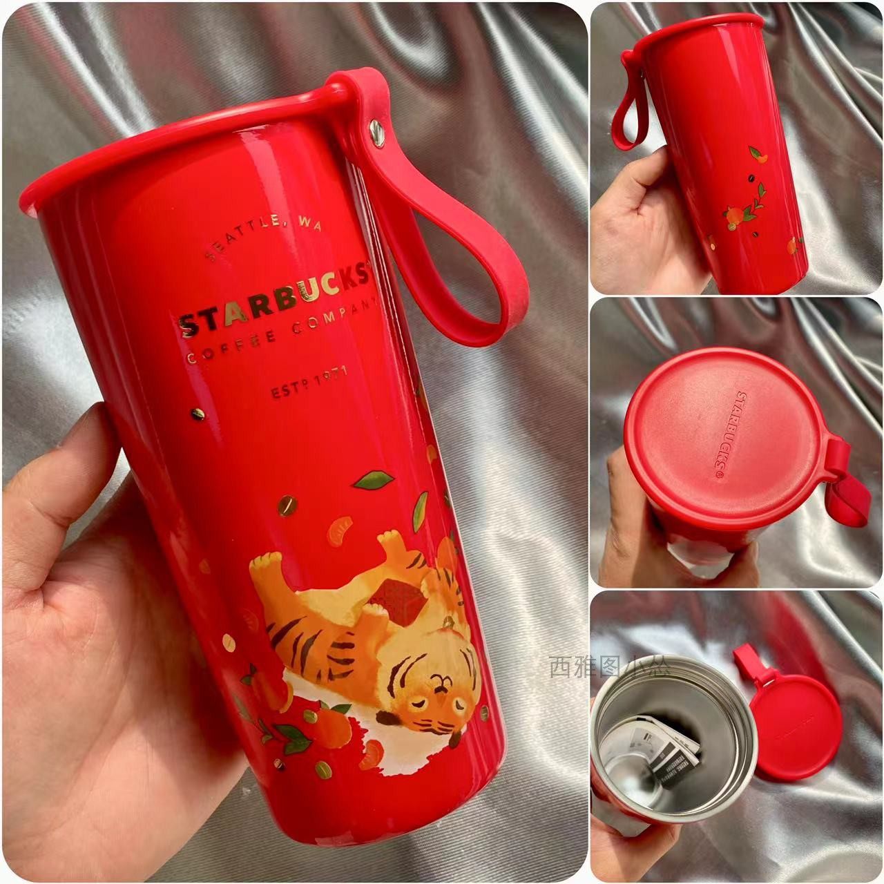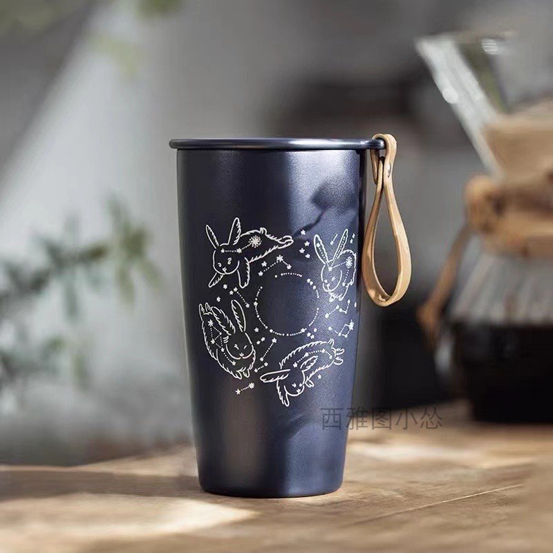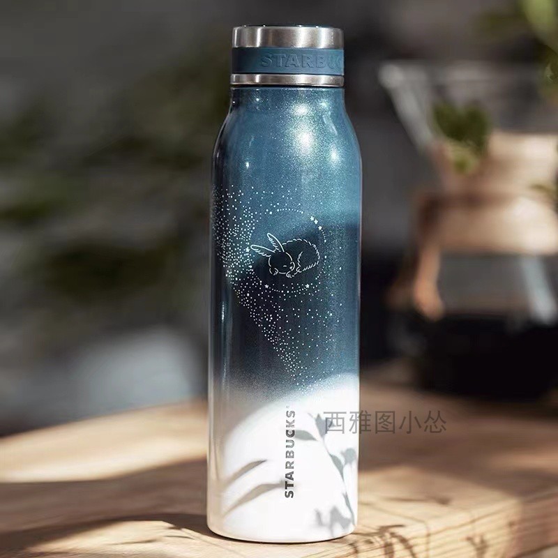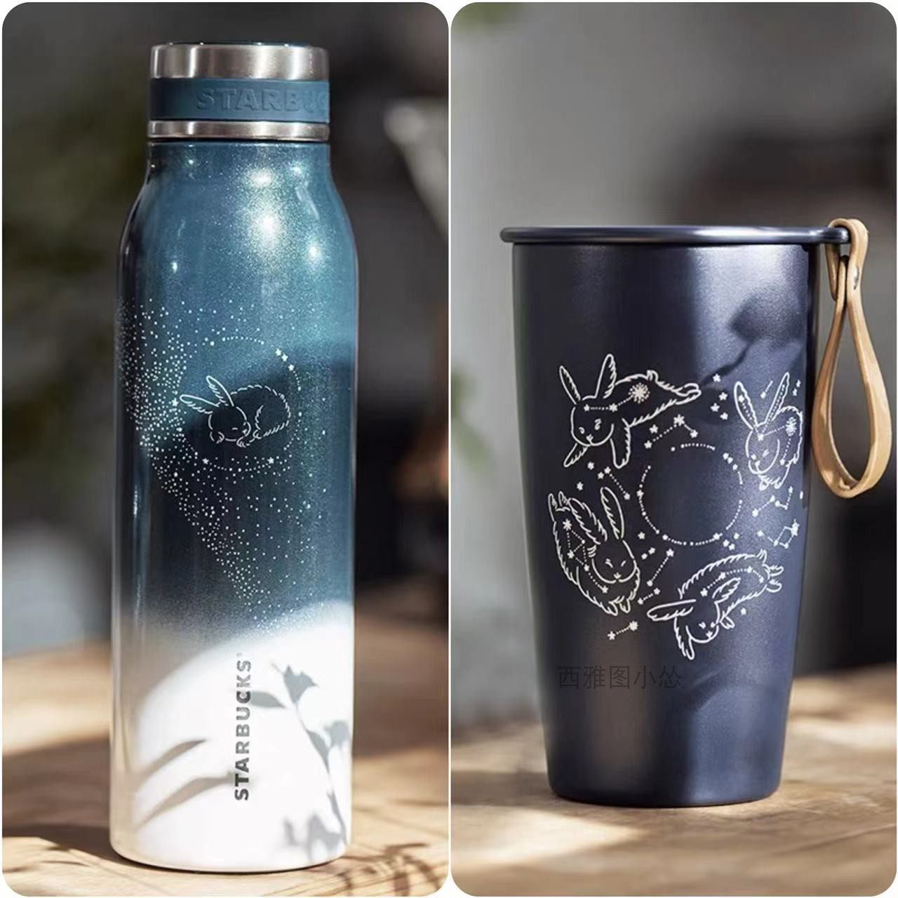 星巴克杯子绿盖柠檬夏日简约双饮口蓝色不锈钢保温瓶提手随行杯