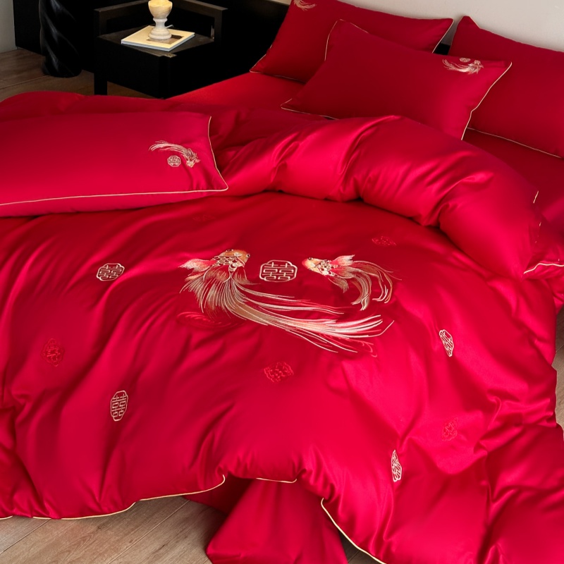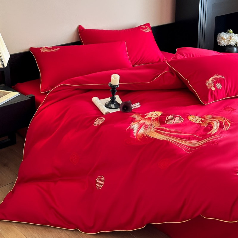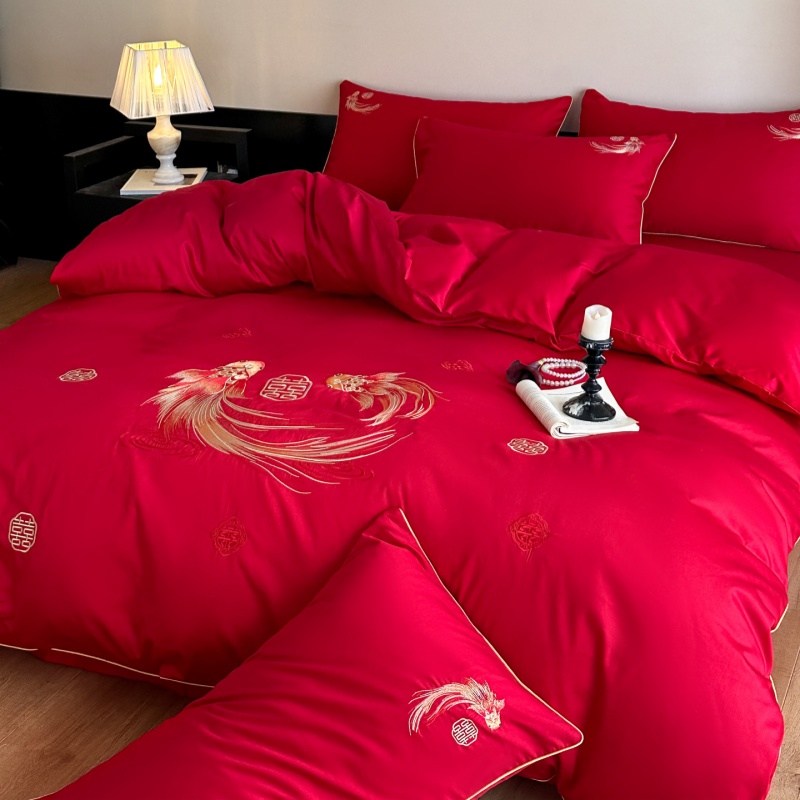 高档中式结婚四件套红色纯棉婚庆喜被套新婚陪嫁床上用品婚房床单