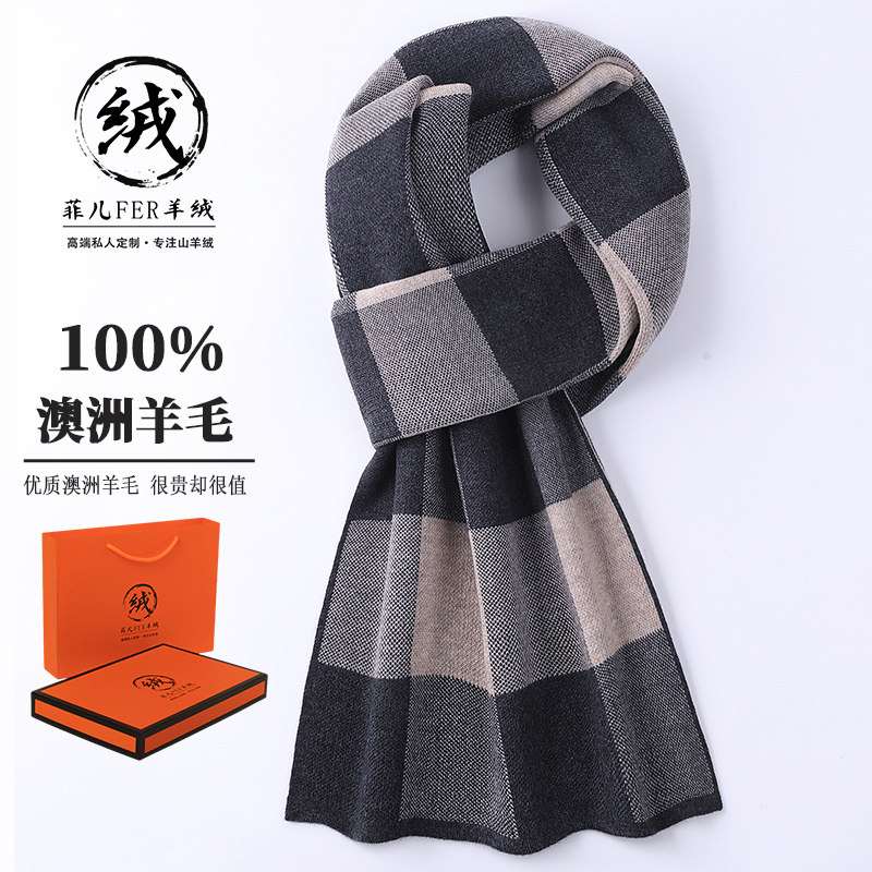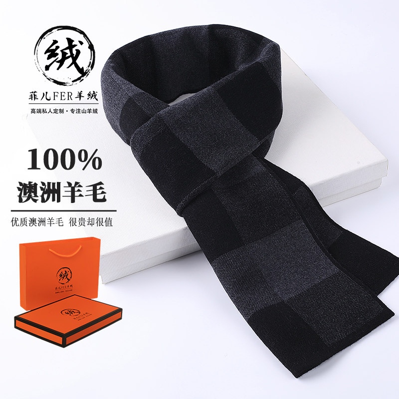 鄂尔多斯市产100%纯羊毛男士格子围巾冬季高档加厚羊绒围脖礼物