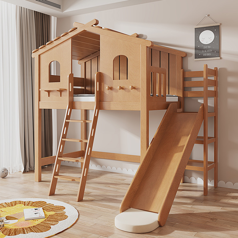 榉木树屋床上下床全实木儿童双层床多功能带滑梯上下铺高低子母床