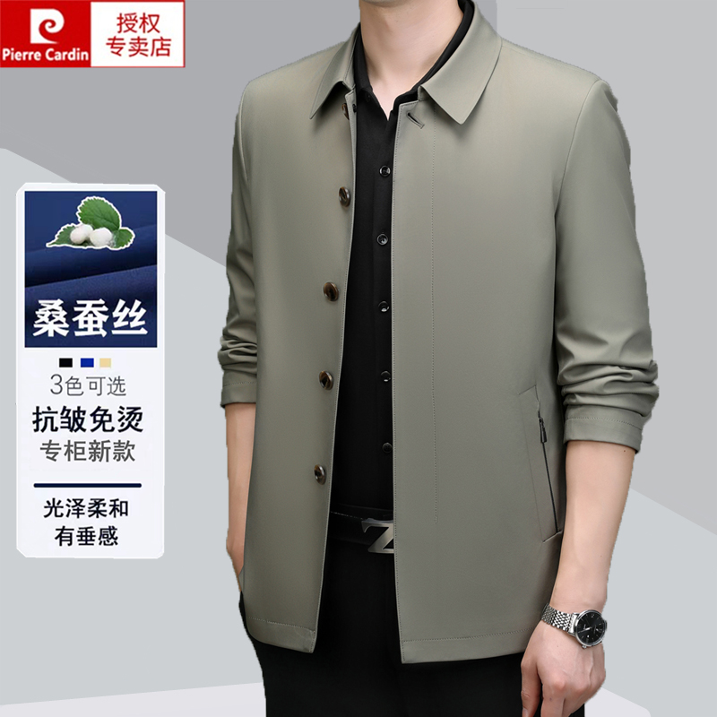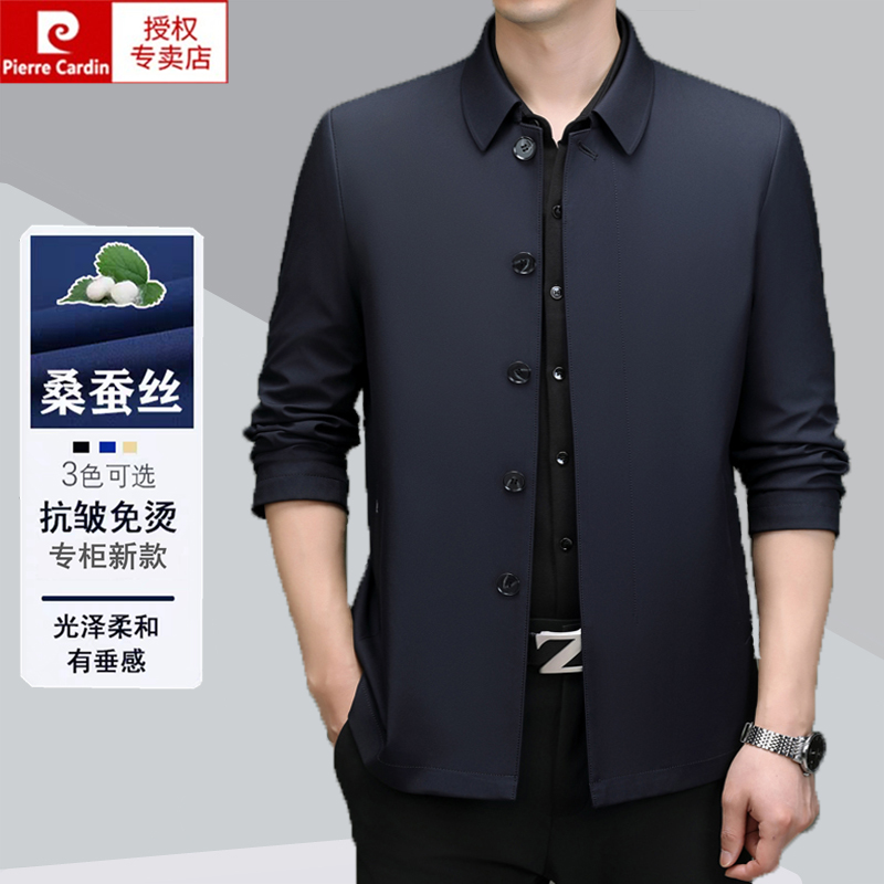 皮尔卡丹中老年5扣纽扣款外套男翻领高端春秋季桑蚕丝夹克爸爸装