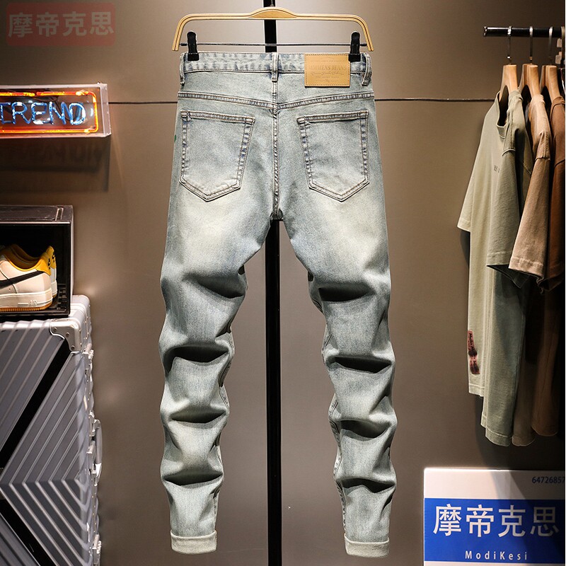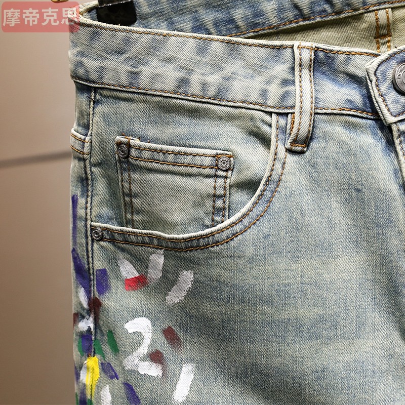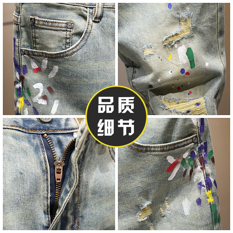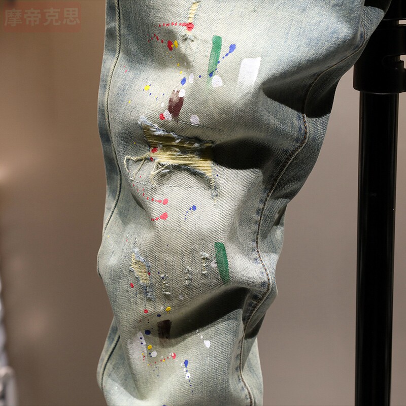 潮牌涂鸦九分牛仔裤男士复古破洞泼墨痞帅修身百搭9分小脚裤韩版