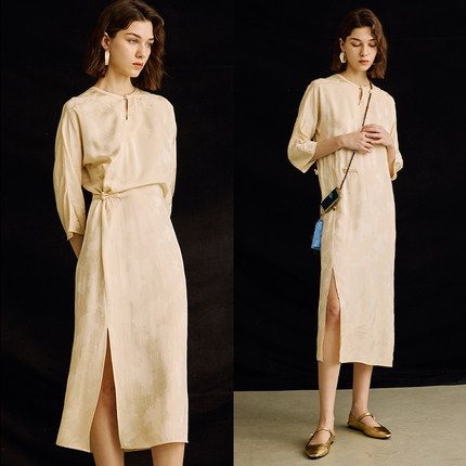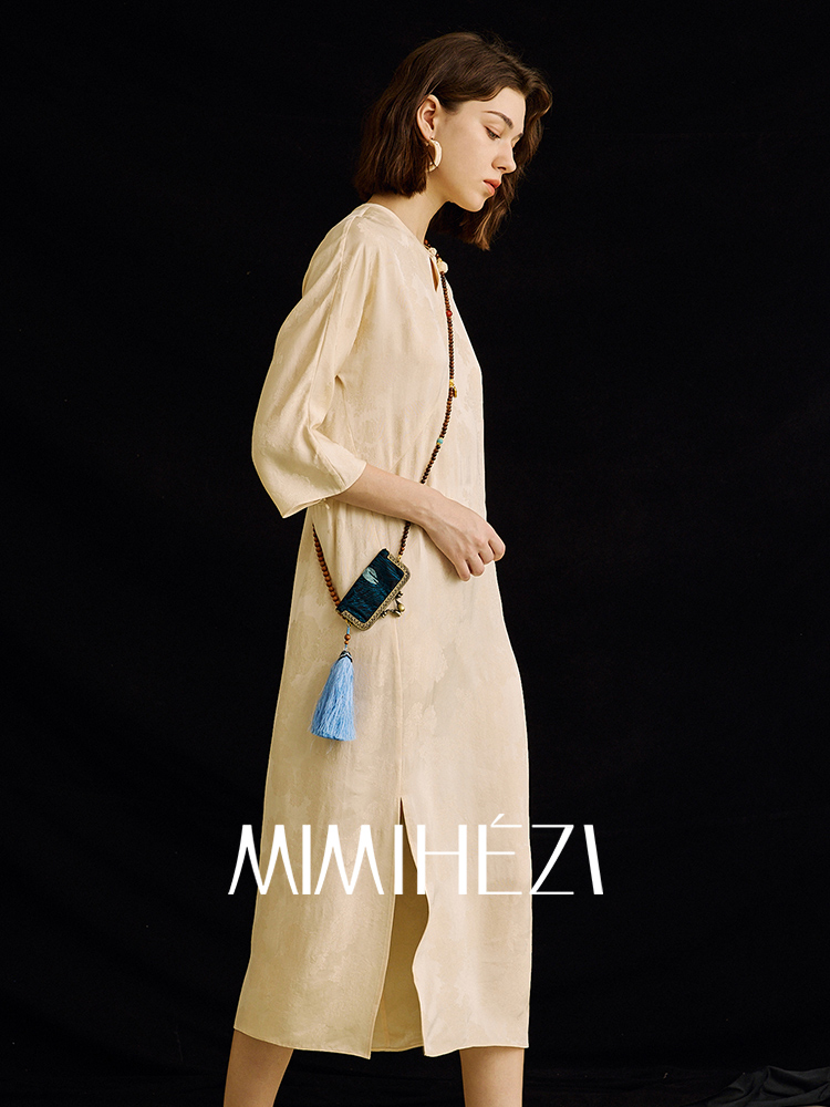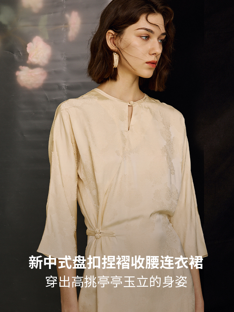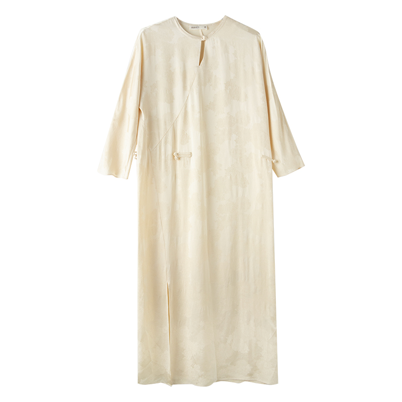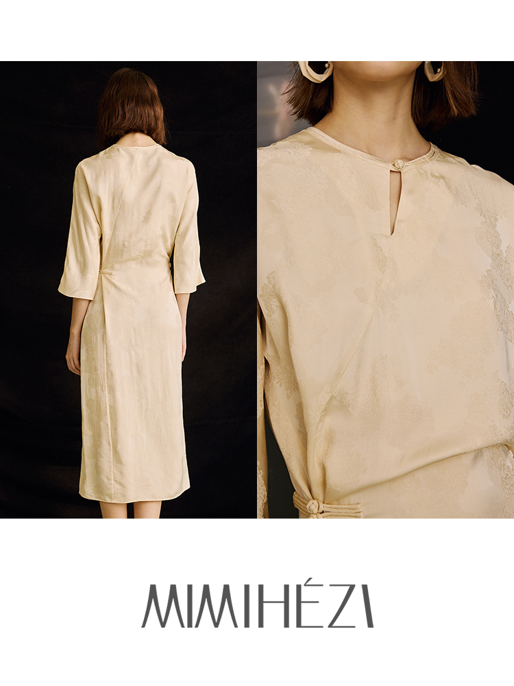 秘密盒子月色薄衣人丝提花新中式盘扣收腰两穿圆领宽松中袖连衣裙