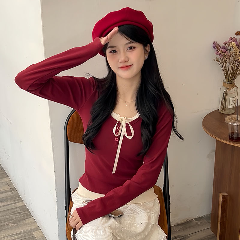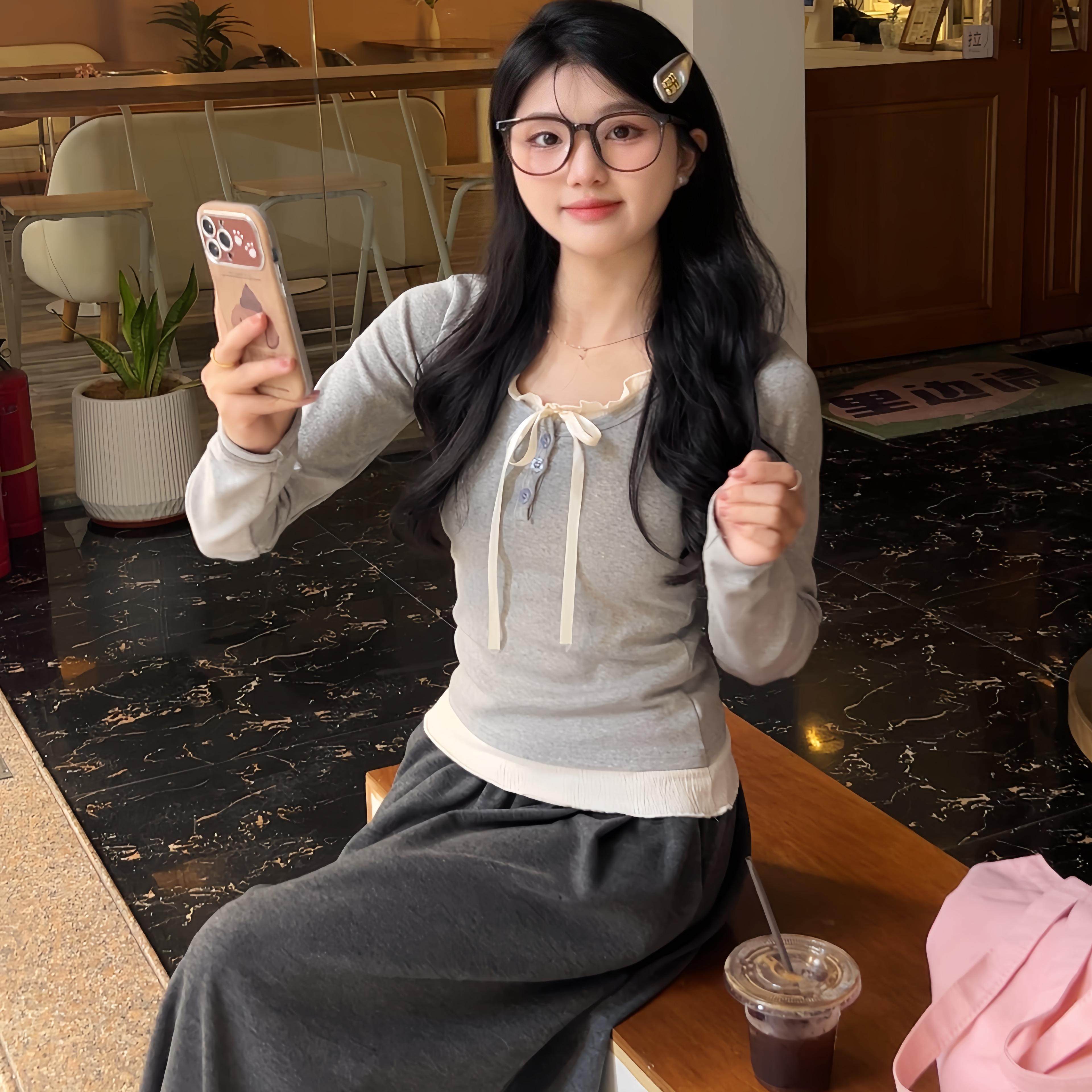 蝴蝶结系带假两件长袖上衣女秋冬韩系穿搭甜妹短款打底针织衫新款