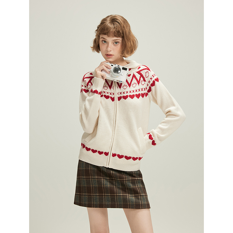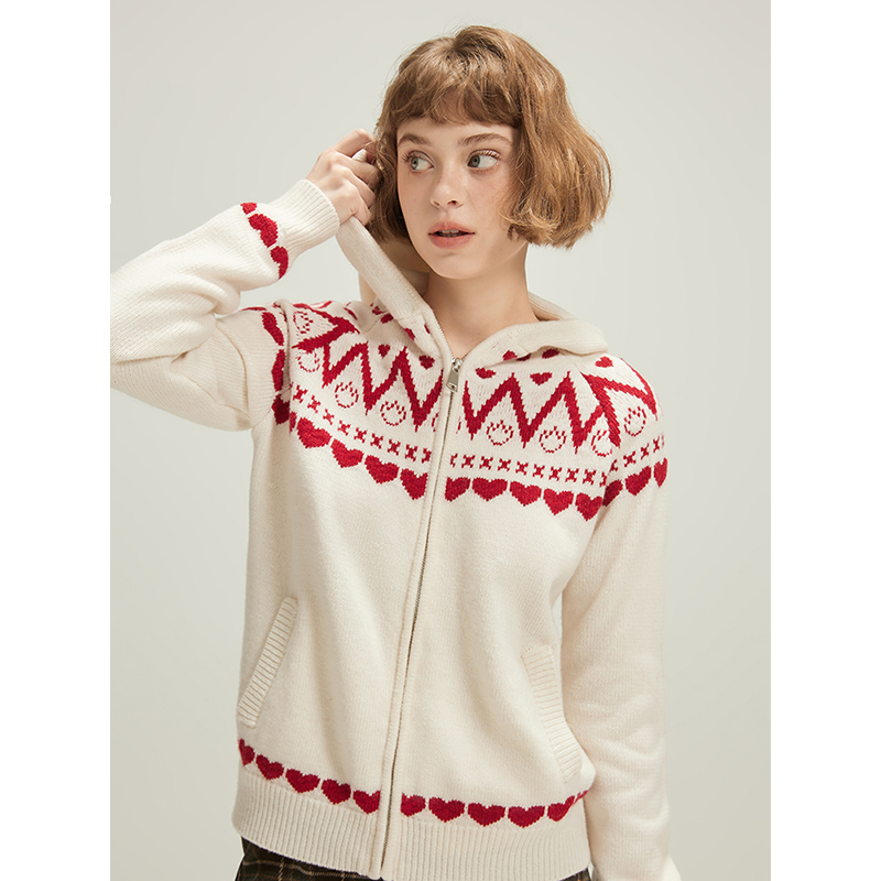 WPsense 费尔岛提花连帽拉链羊毛针织开衫外套女秋季设计感毛衣