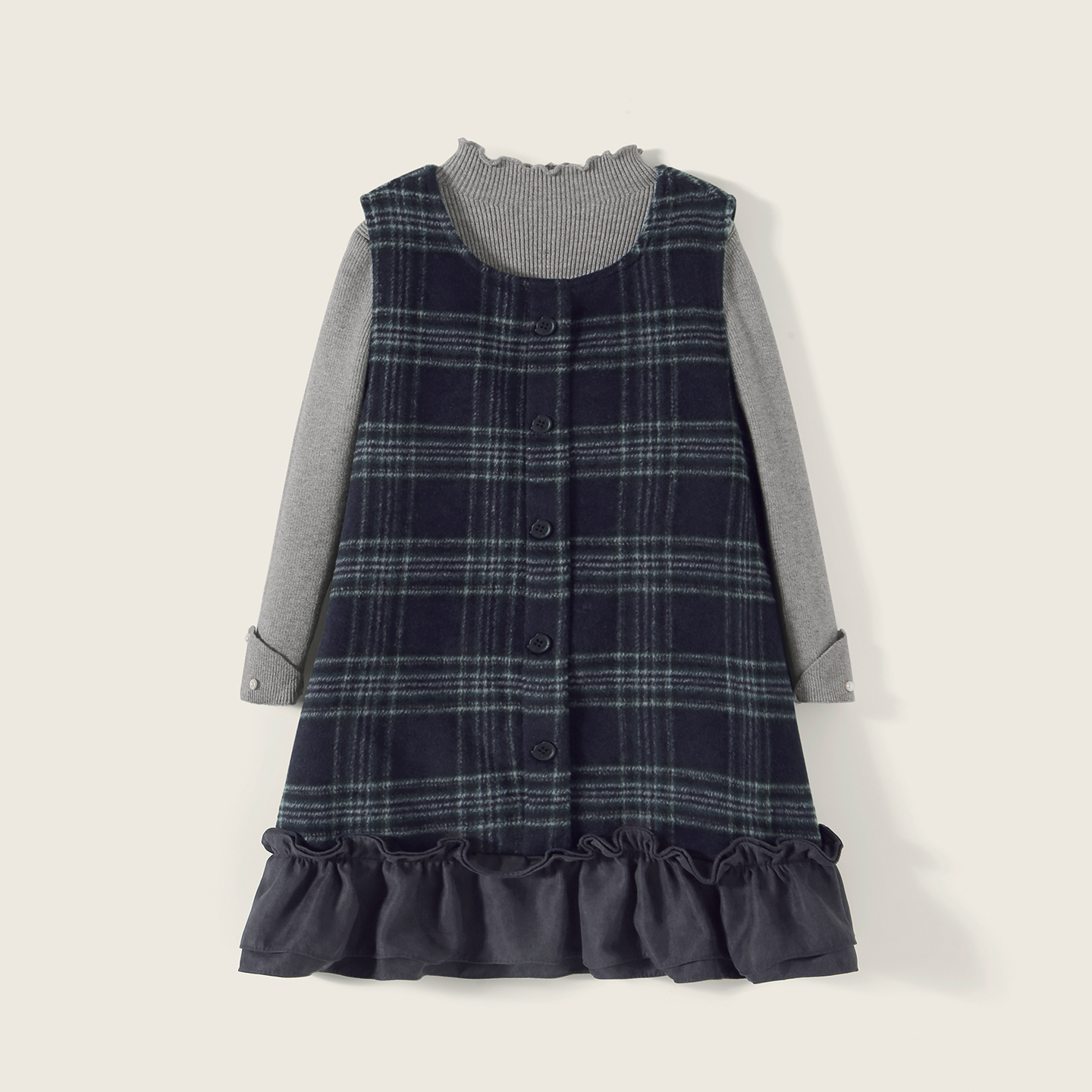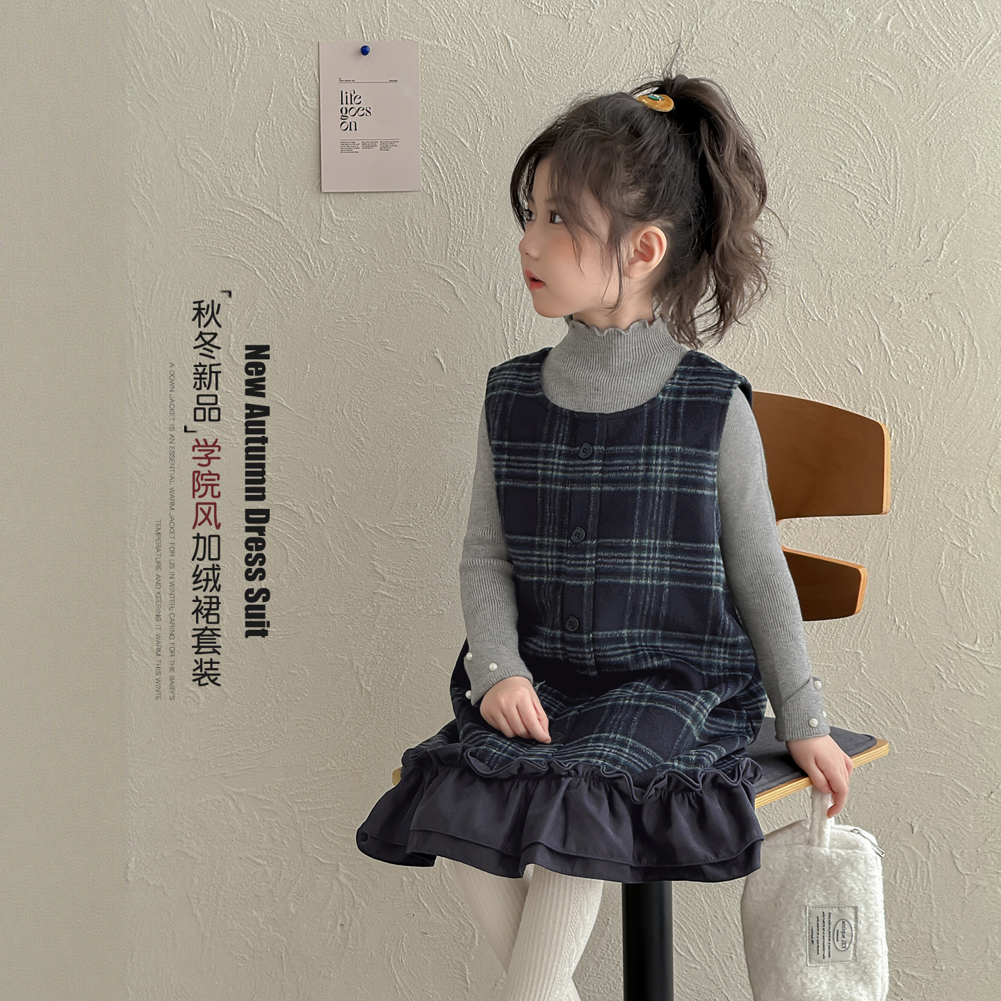 女童加绒套装秋冬2025新款儿童冬装加厚格子背心裙女孩半高领毛衣