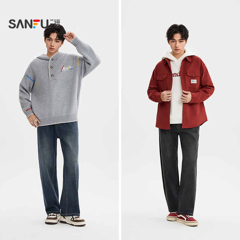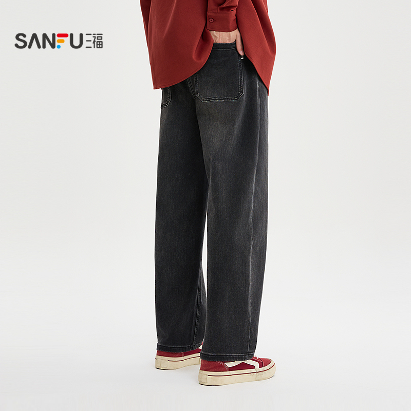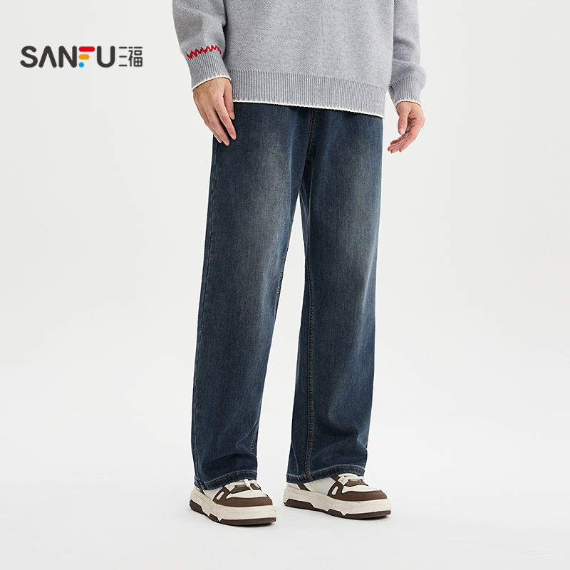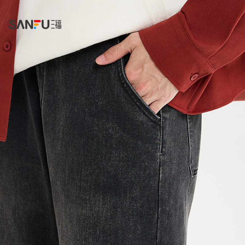 三福2025冬季男士洗水仿针织牛仔裤休闲宽松直筒长裤裤子510086