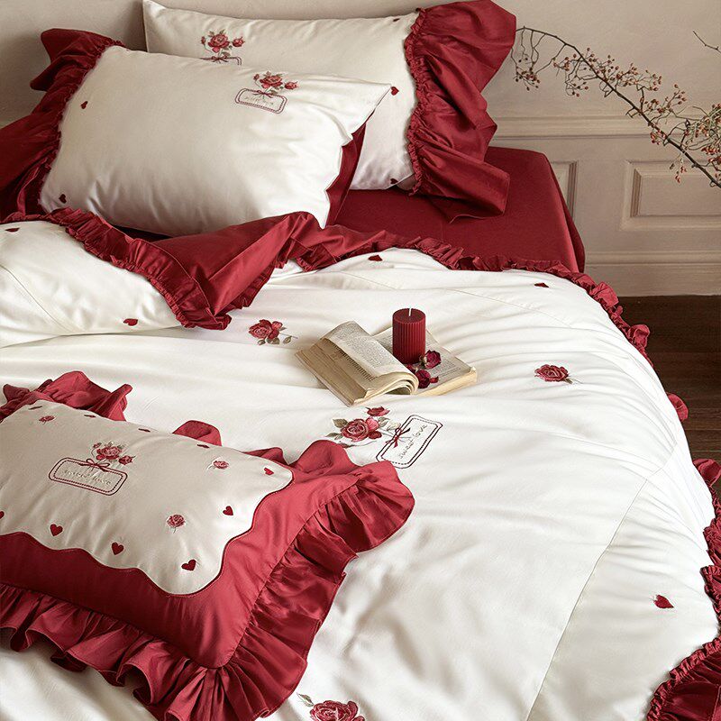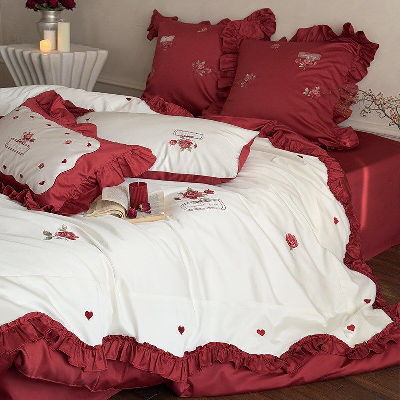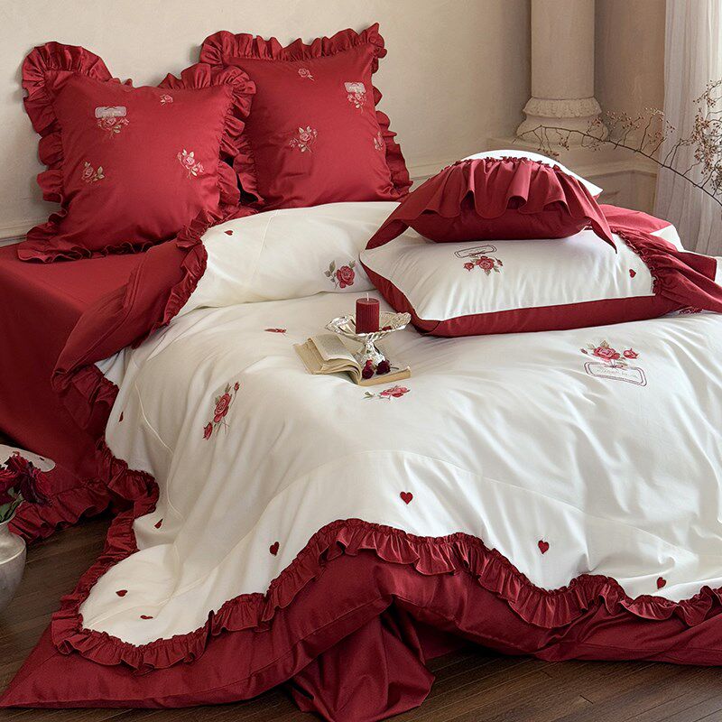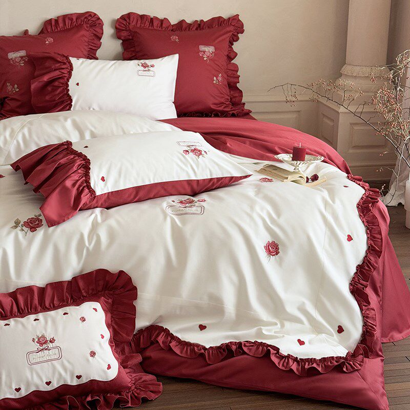 浪漫风红色玫瑰绣花长绒棉四件套全棉被套结婚床单高级感床品