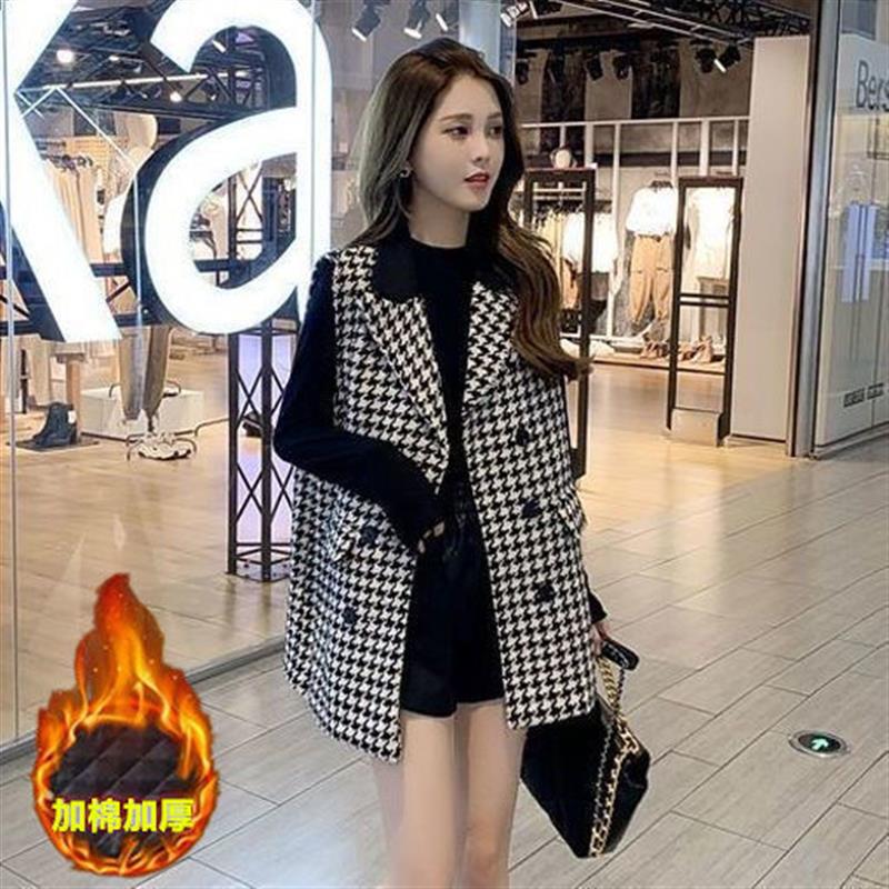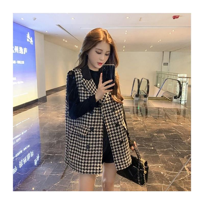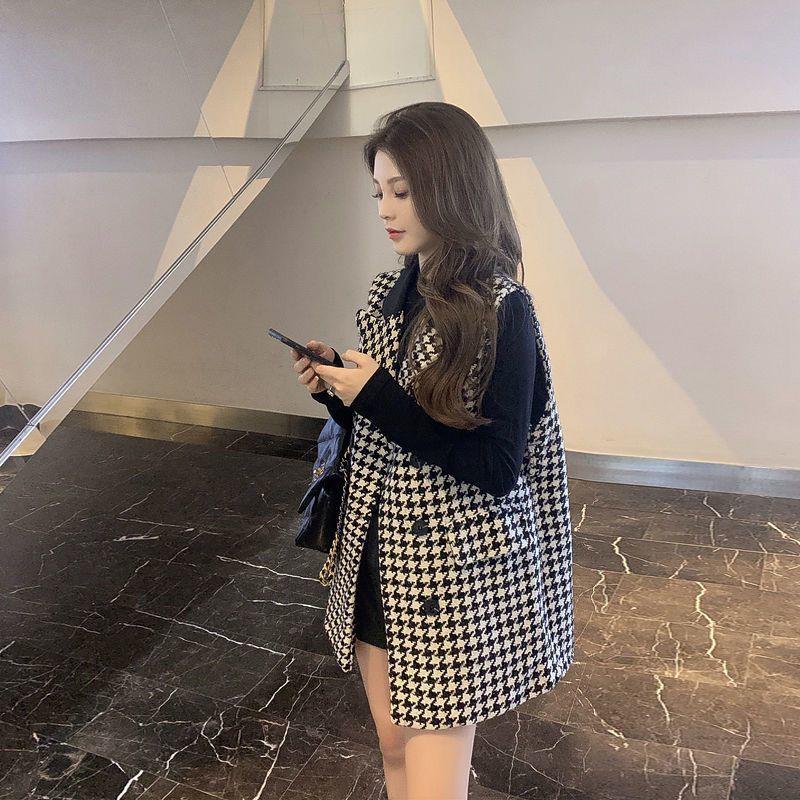 大码女装千鸟格小香风西装领马甲秋冬新款中长款外穿无袖背心外套