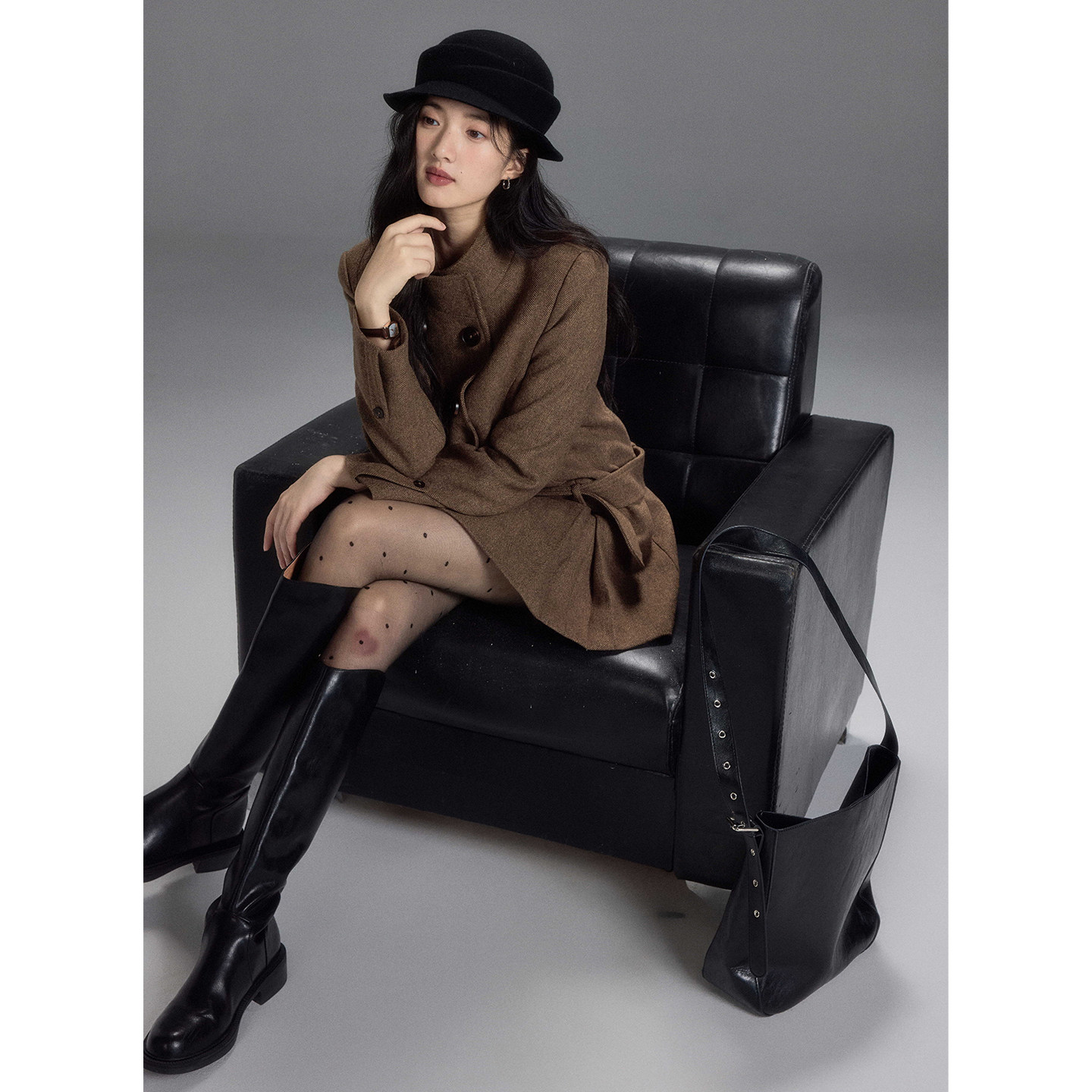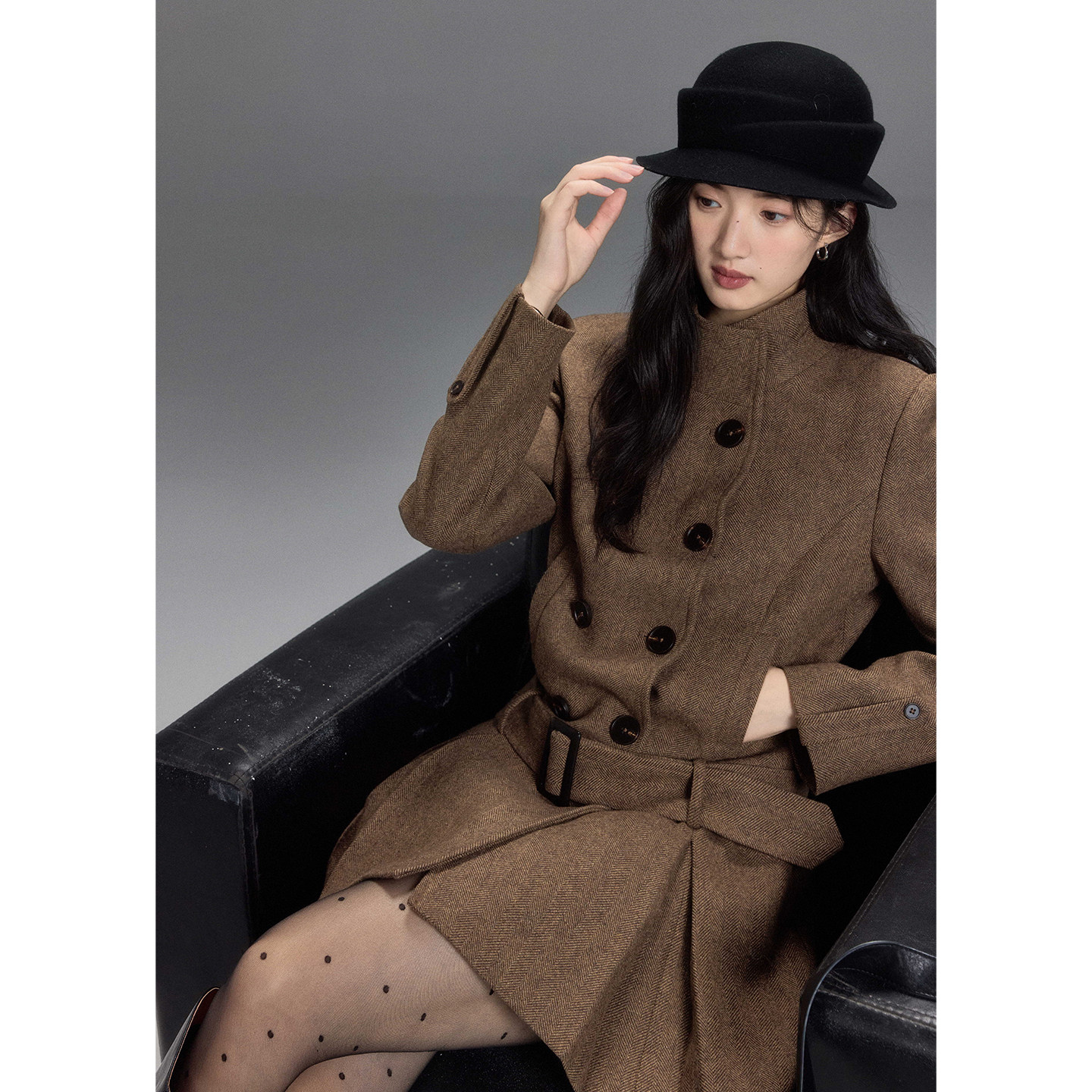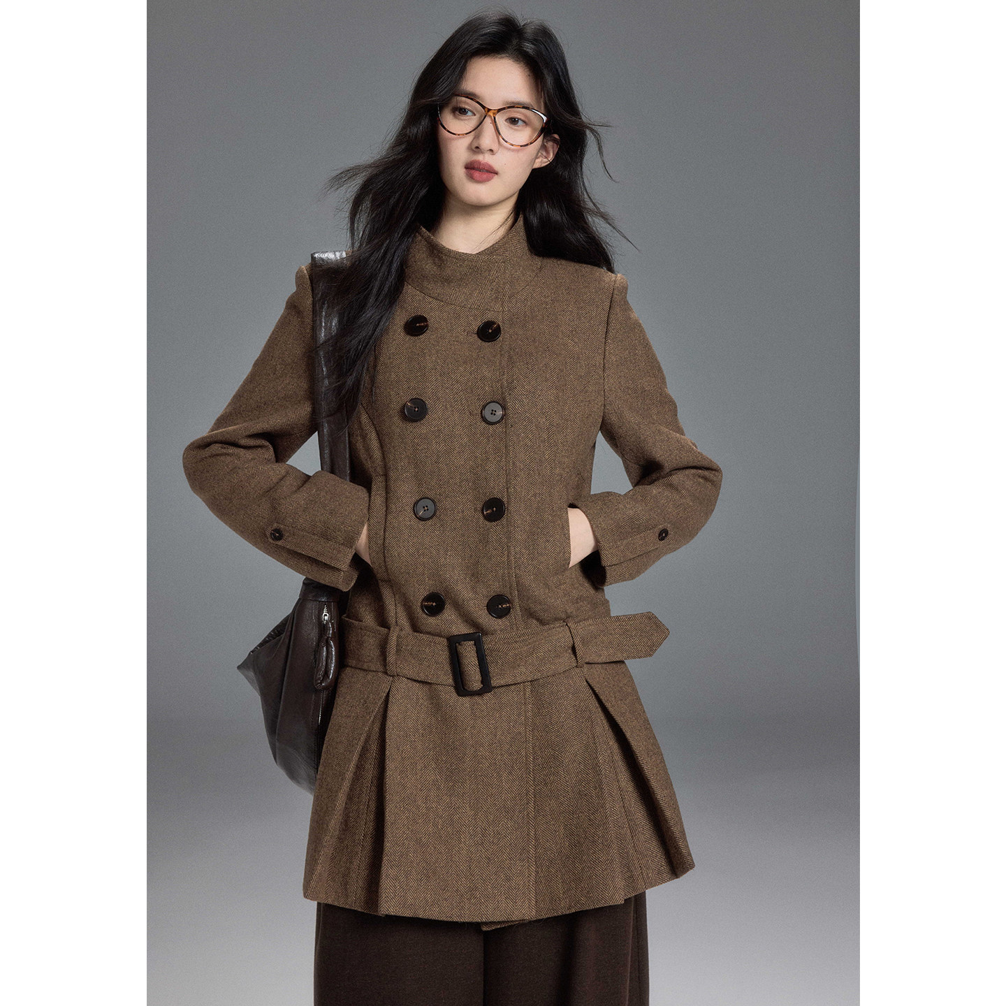 贰羊设计【枫栖】复古千金双排扣羊毛连衣裙式气质人字纹毛呢外套
