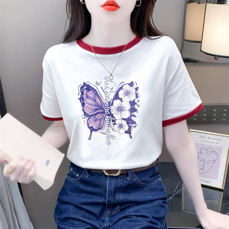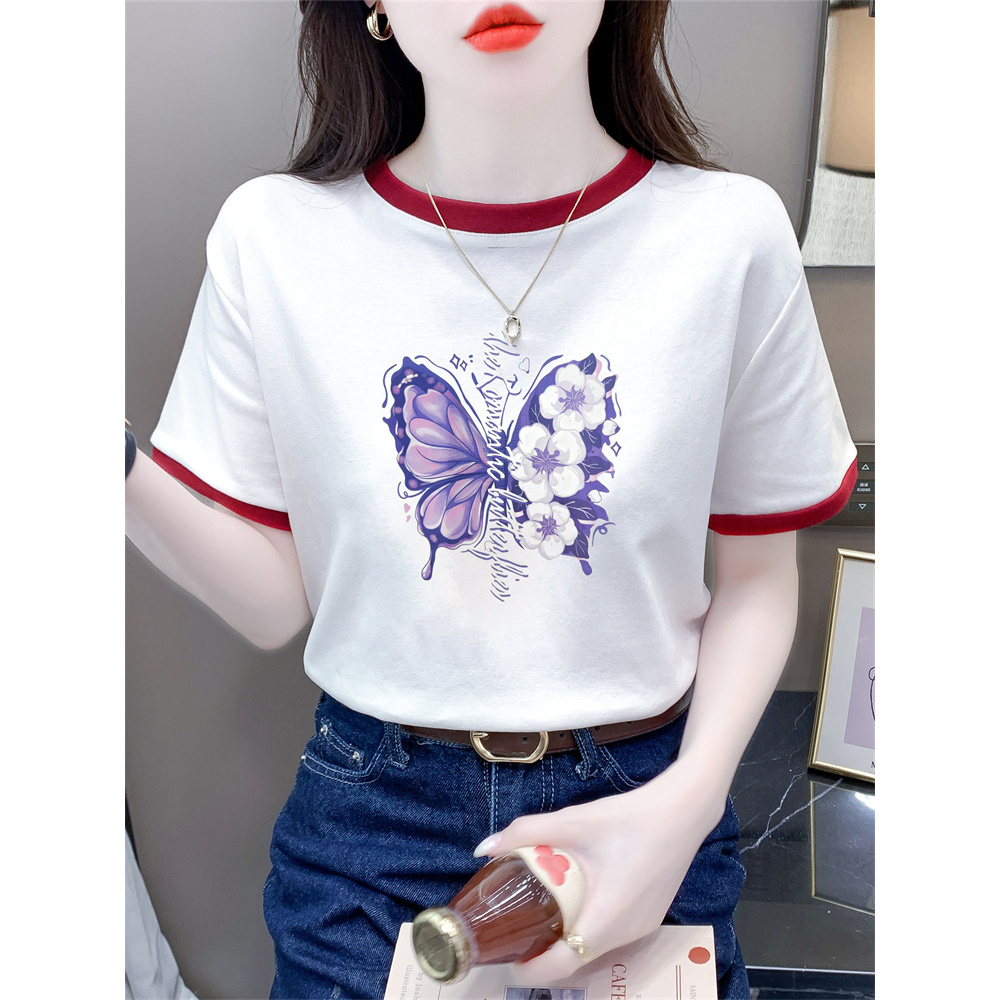 时尚蝴蝶印花短袖t恤女夏装新款宽松显瘦纯棉ins潮红领撞色上衣潮