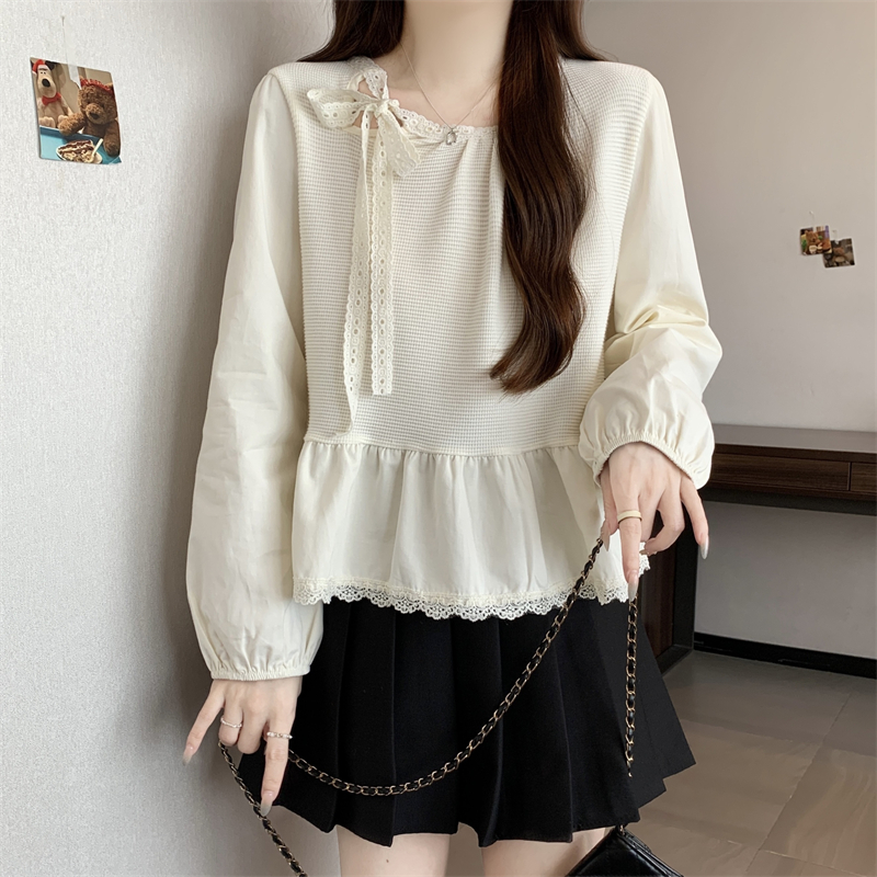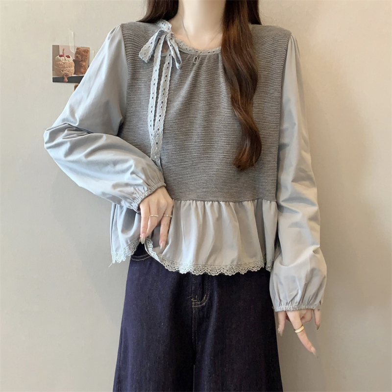 MM谢谢家大码假两件针织拼接长袖衬衫女秋季系带减龄显瘦上衣宽松