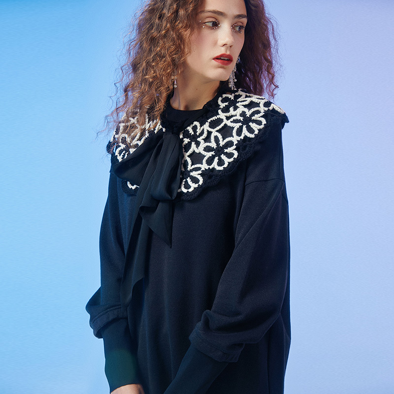 莲灿outlets秋季新商场同款宽松修身百搭手工钩织领花针织连衣裙
