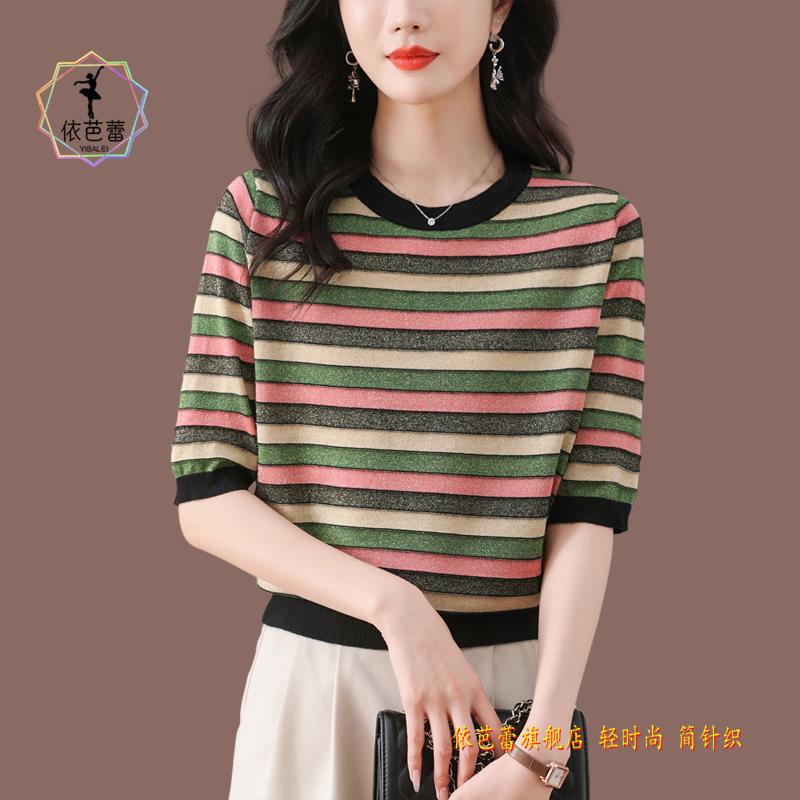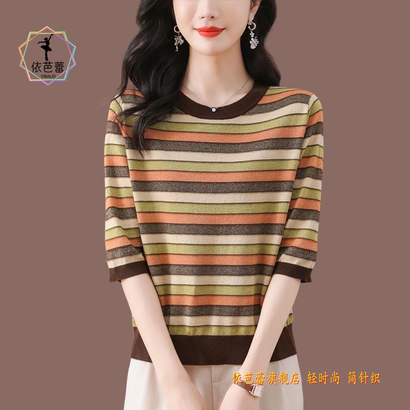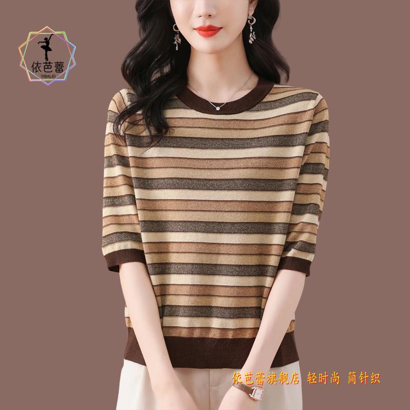 早秋七分袖羊毛小衫女宽松条纹上衣洋气妈妈春秋装中袖打底针织衫
