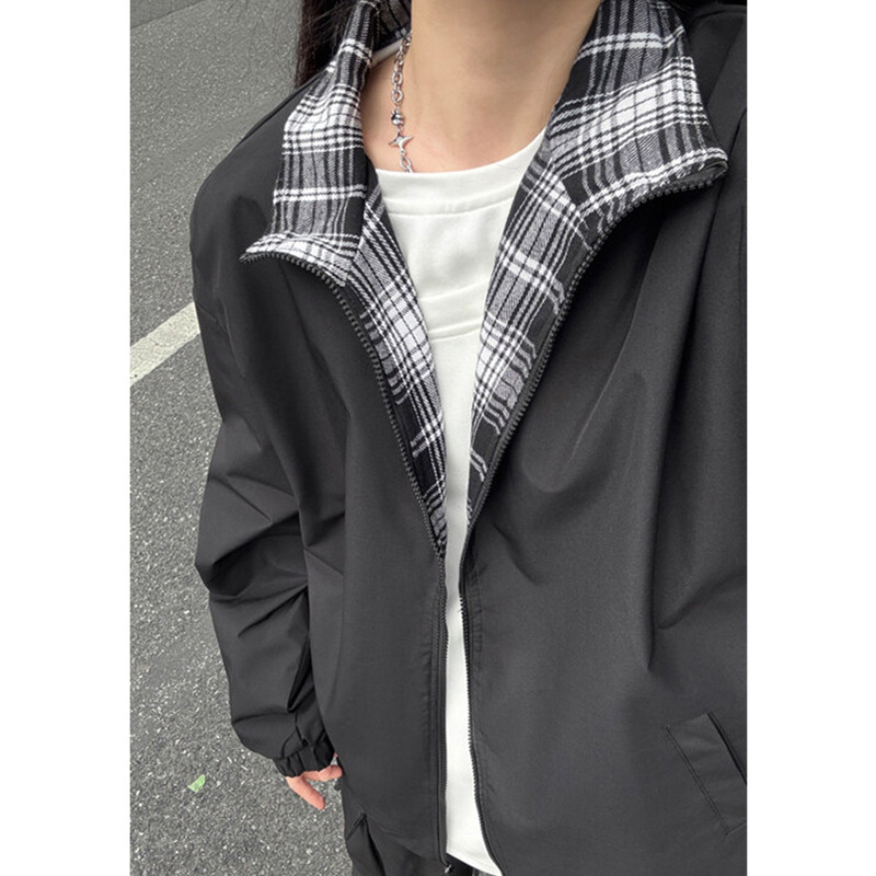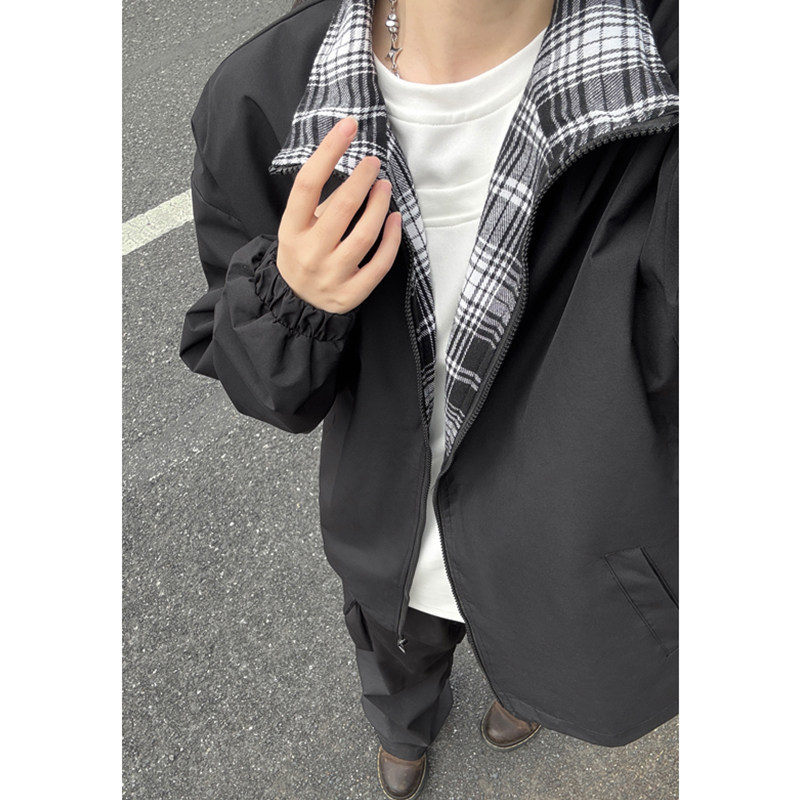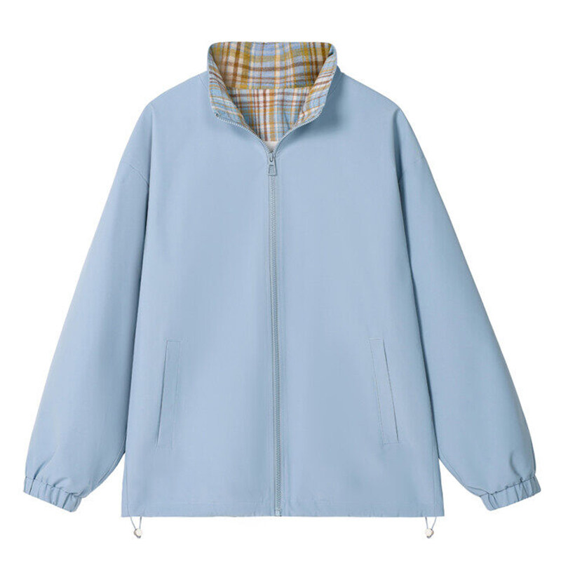 蓝色格子内衬夹克男生春秋张色拼接设计感外套潮牌立领情侣棒球服