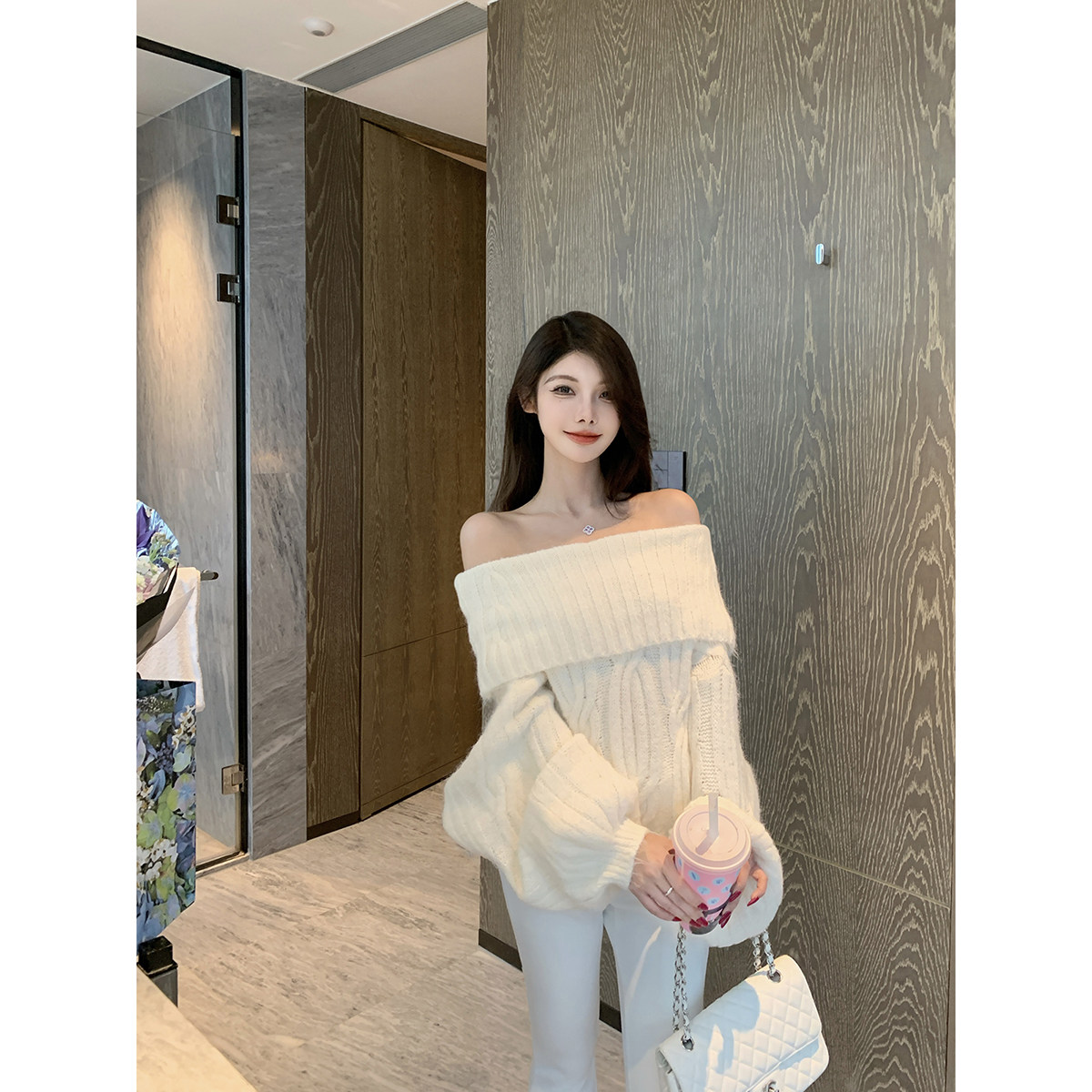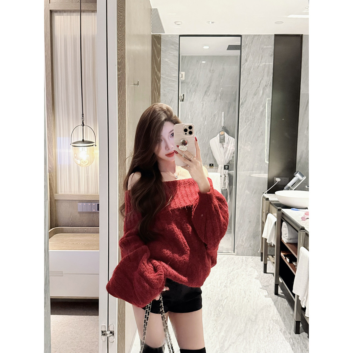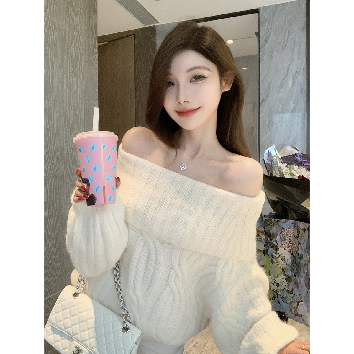 JustQin【曼城旧事】2025新款秋冬新款加厚性感一字肩毛衣女外套