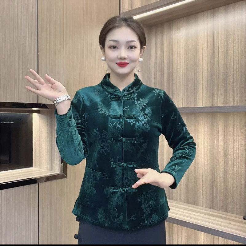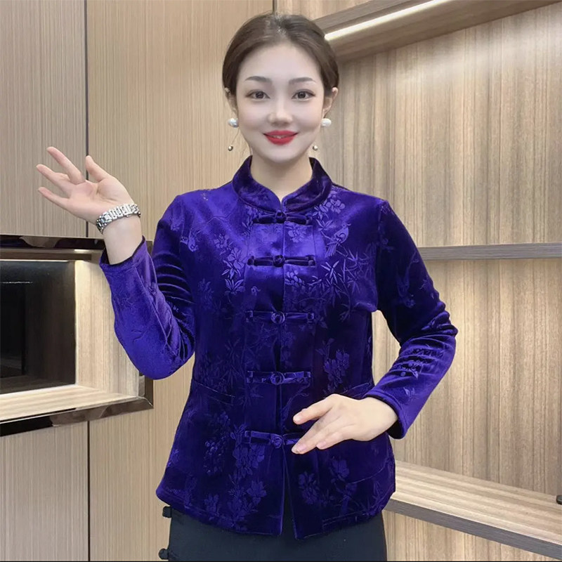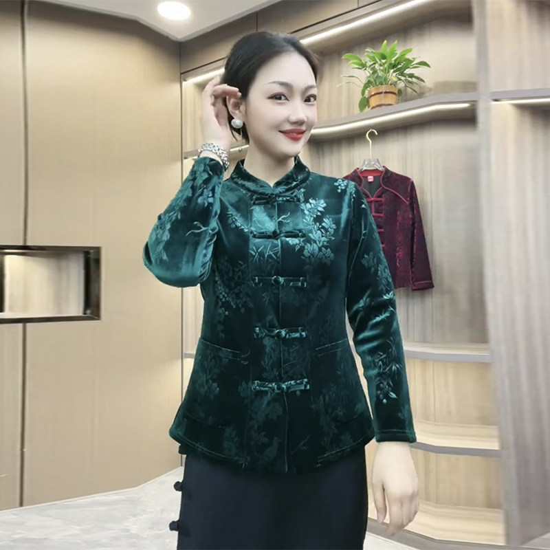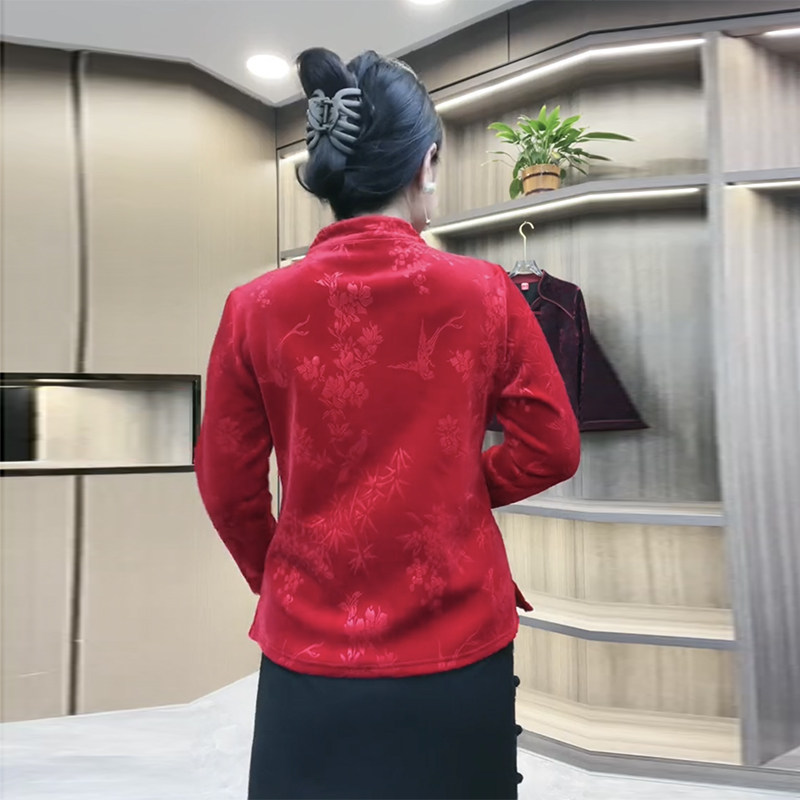 中老年妈妈丝绒外套年货新款中式旗袍上衣盘扣加绒唐装红色棉服女