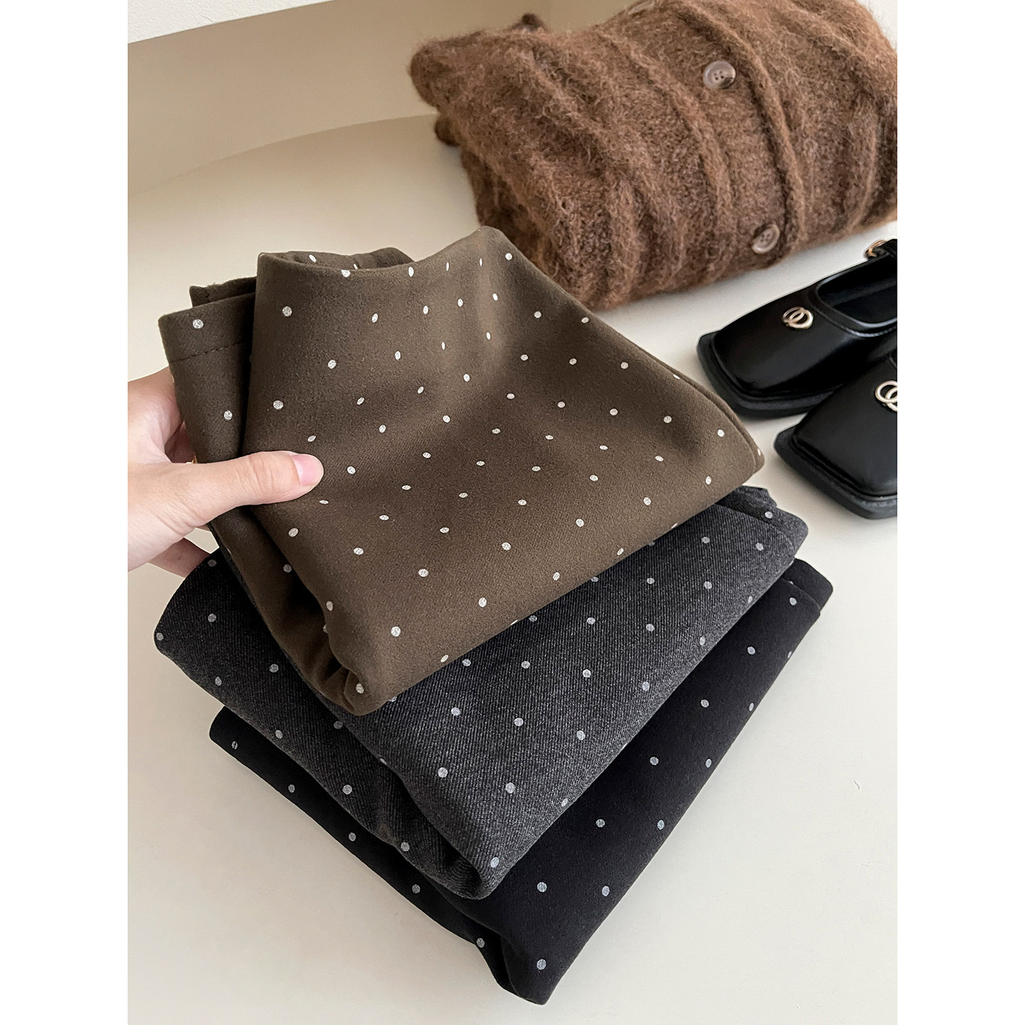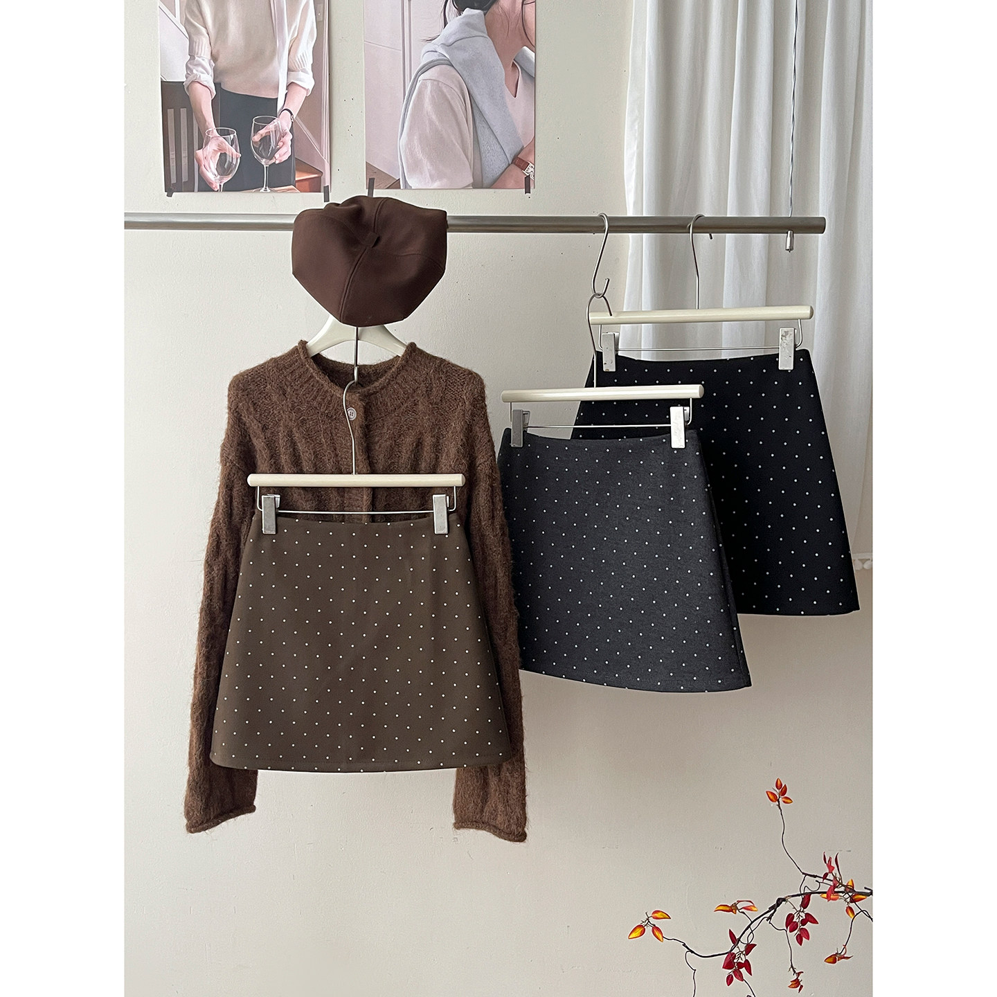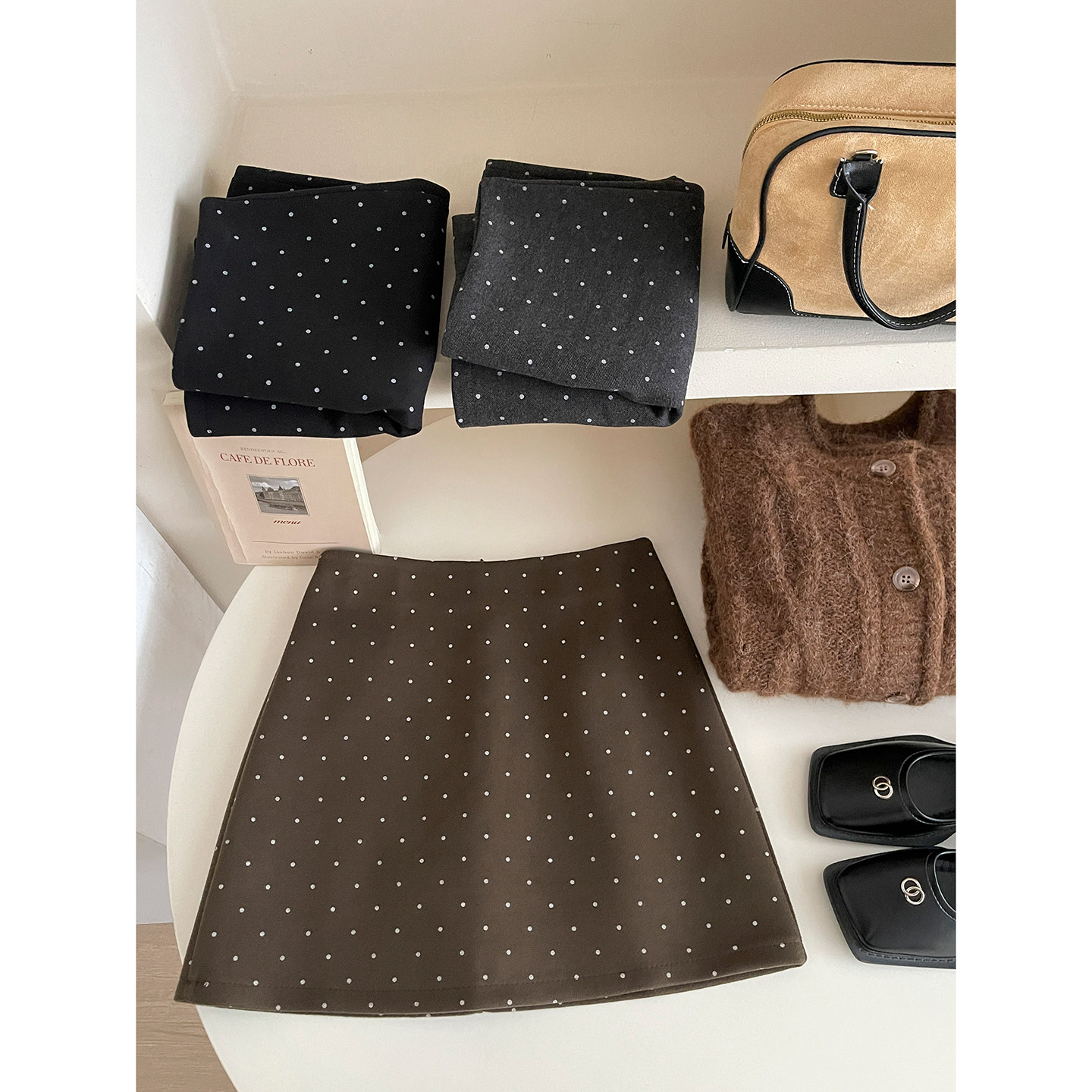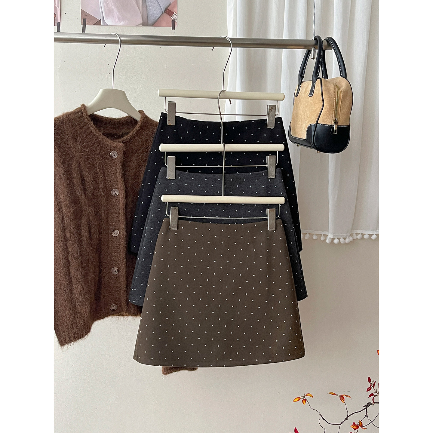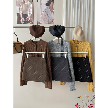 日韩miu系咖色小波点毛呢料短裙