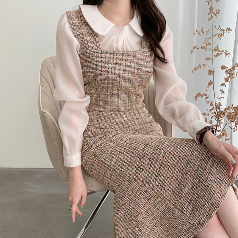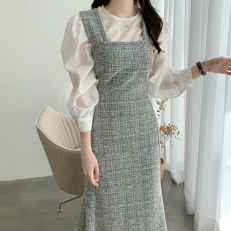 韩国chic早秋法式复古方领修身显瘦无袖粗花呢包臀鱼尾背带连衣裙