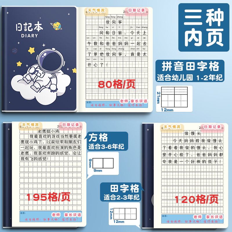 日记本小学生三年级小方格胶套本一年级二年级拼音田字方格本a5加厚小孩儿童男孩女孩小学生用作业笔记本子