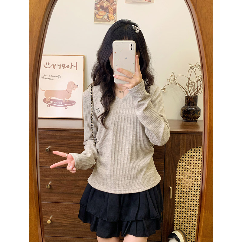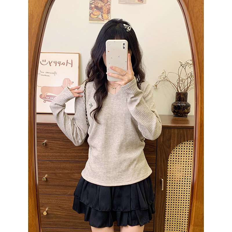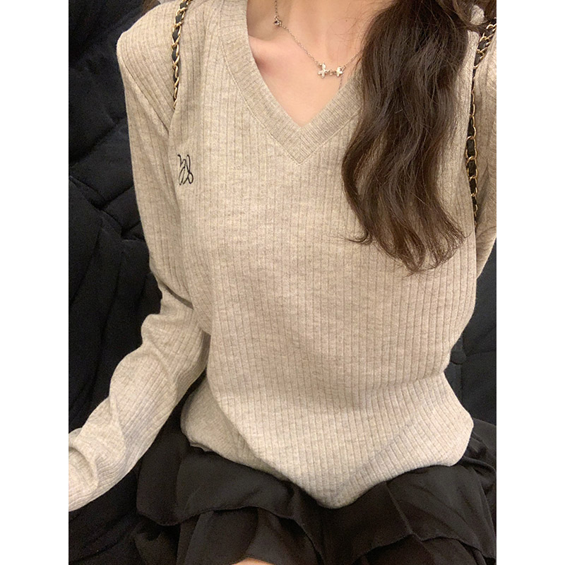 红续简约基础款刺绣V领针织长袖T恤女复古收腰纯色正肩打底衫上衣
