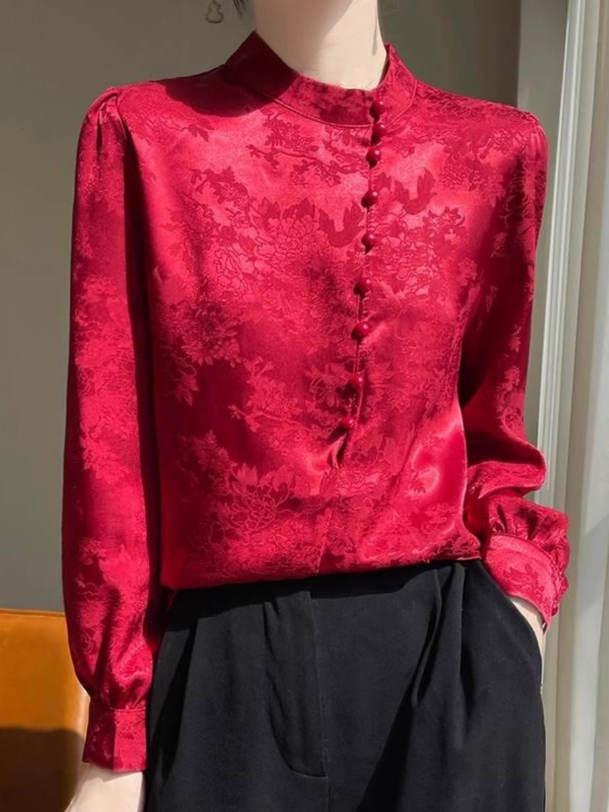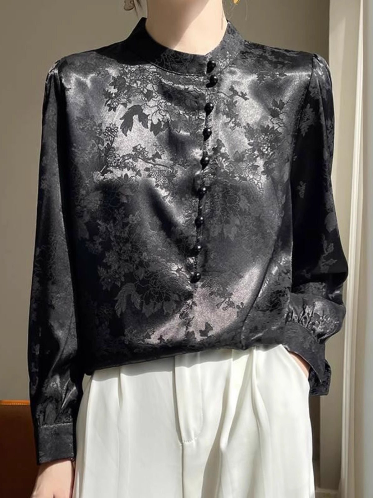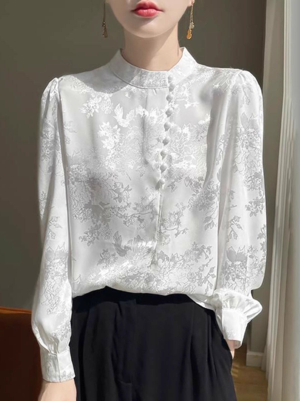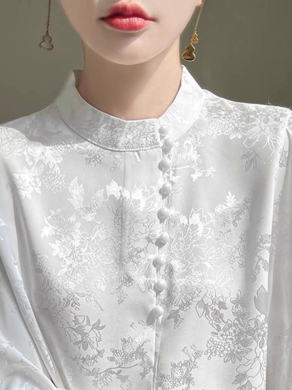 轻国风白色真丝衬衫女职场穿搭春季长袖立领衬衣中式印花通勤上衣