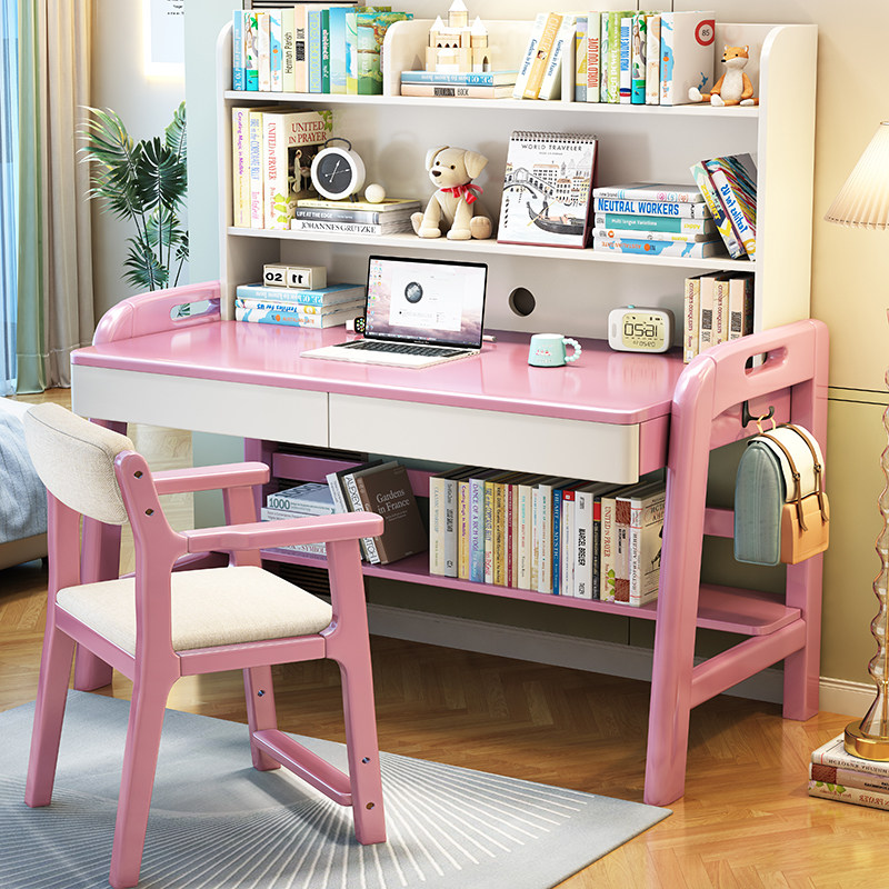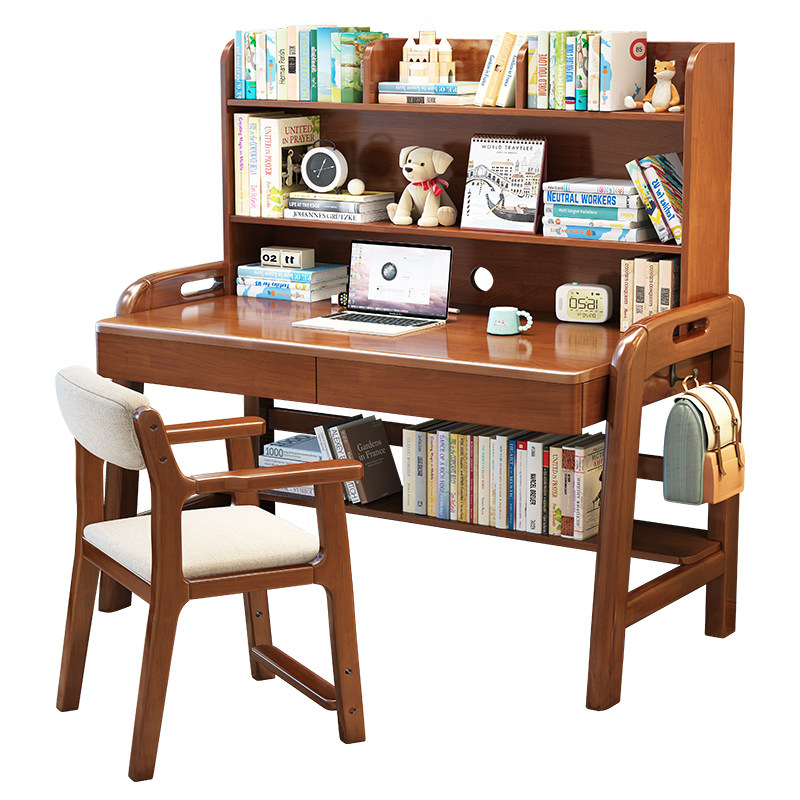 实木书桌带书架学l生家用学习桌椅小户型卧室床边桌儿童书桌一体