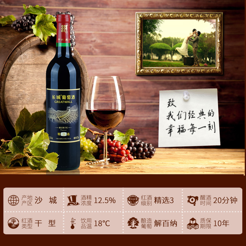 国货红酒 长城精选3彩标解百纳筒装干红葡萄酒 整箱六盒750mL*6瓶
