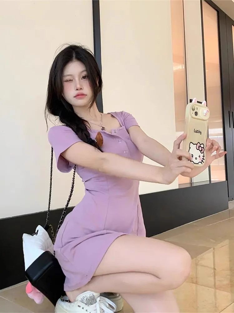 性感甜辣妹方领短袖大码连衣裙女夏季小个子胖MM修身收腰包臀裙潮