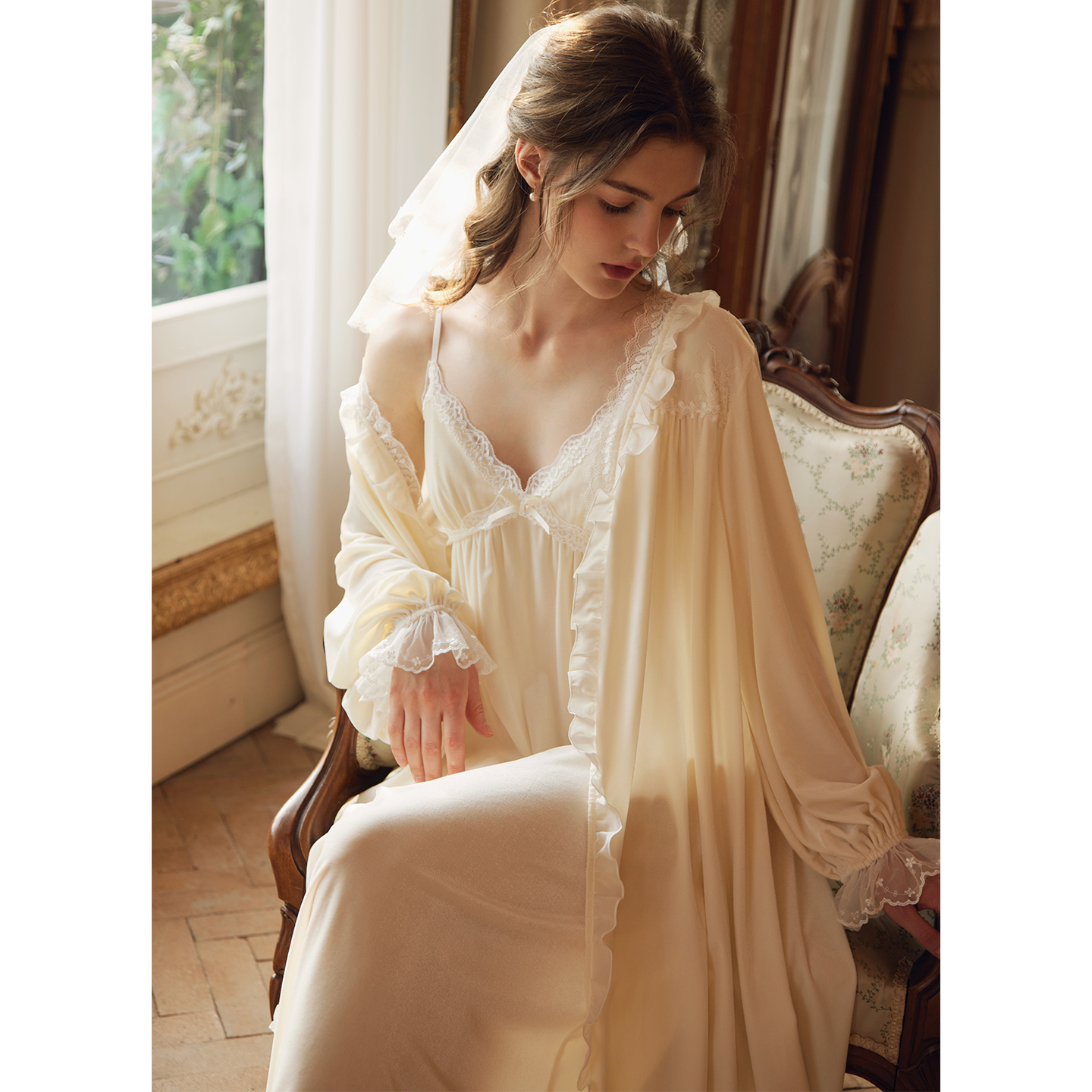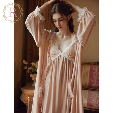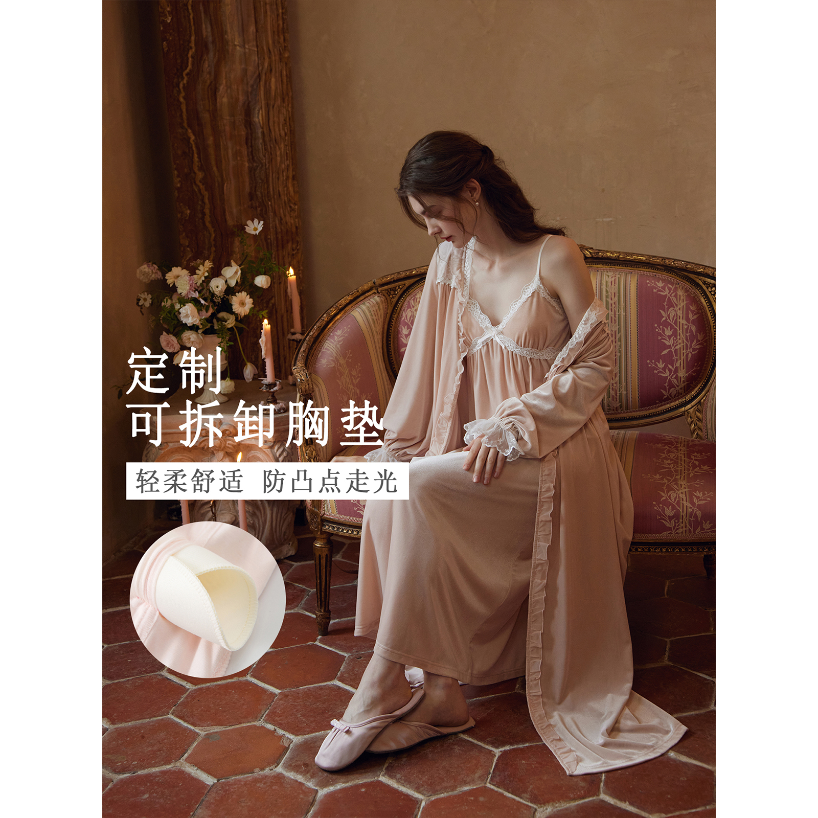 RoseTree新娘晨袍女春秋季长袖长睡袍法式性感睡衣睡裙套装带胸垫