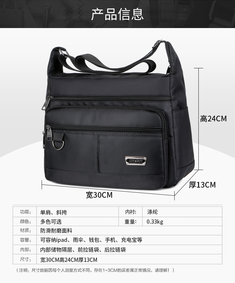【六拉链】男包大容量牛津布包结实耐磨休闲单肩包男士斜挎包防水