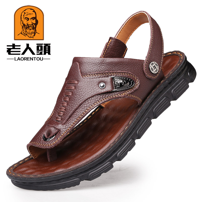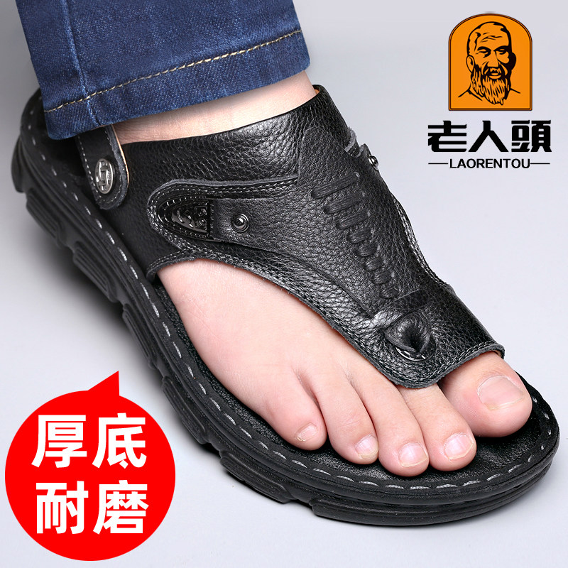 老人头真皮夏季透气夹脚沙滩鞋