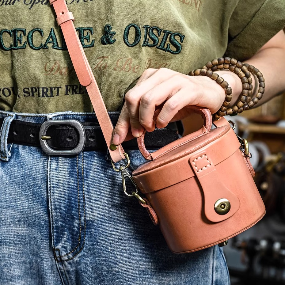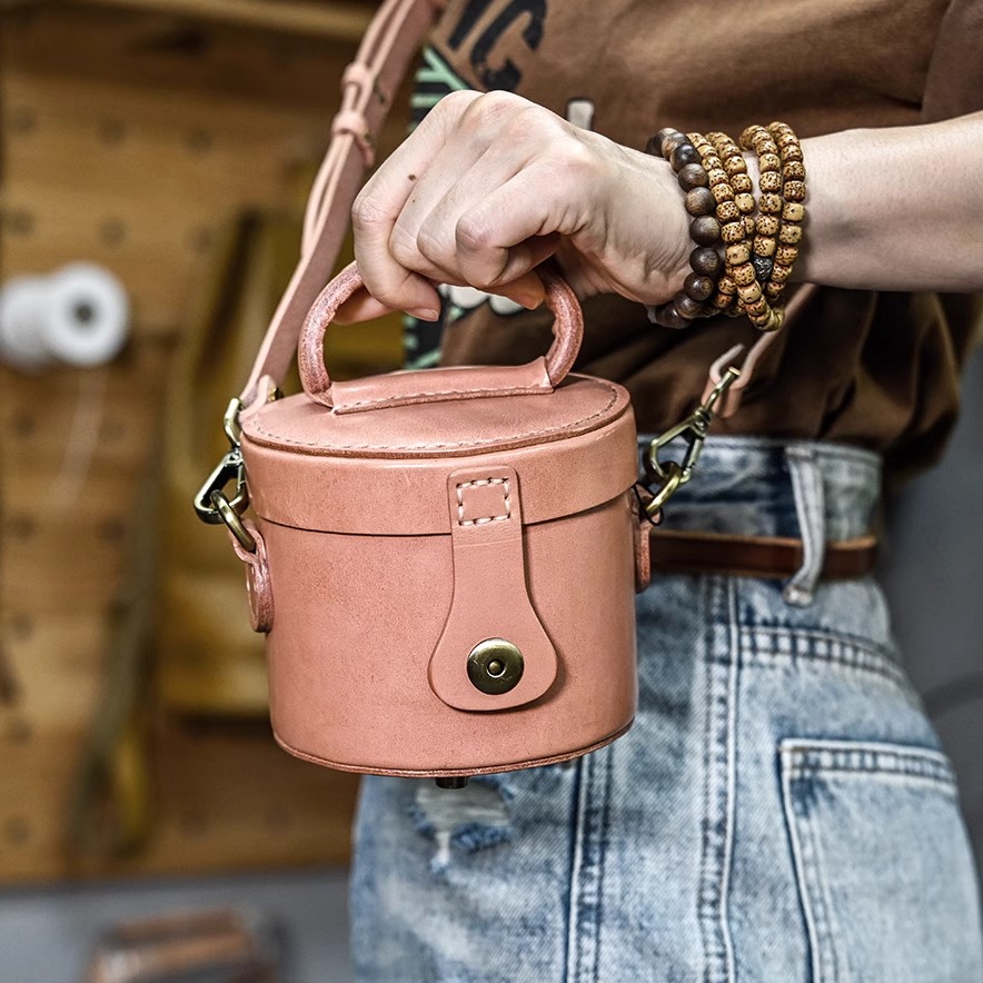 复古手工包圆筒水桶包小挎包真皮斜跨包植鞣牛皮女包学硬皮定型包