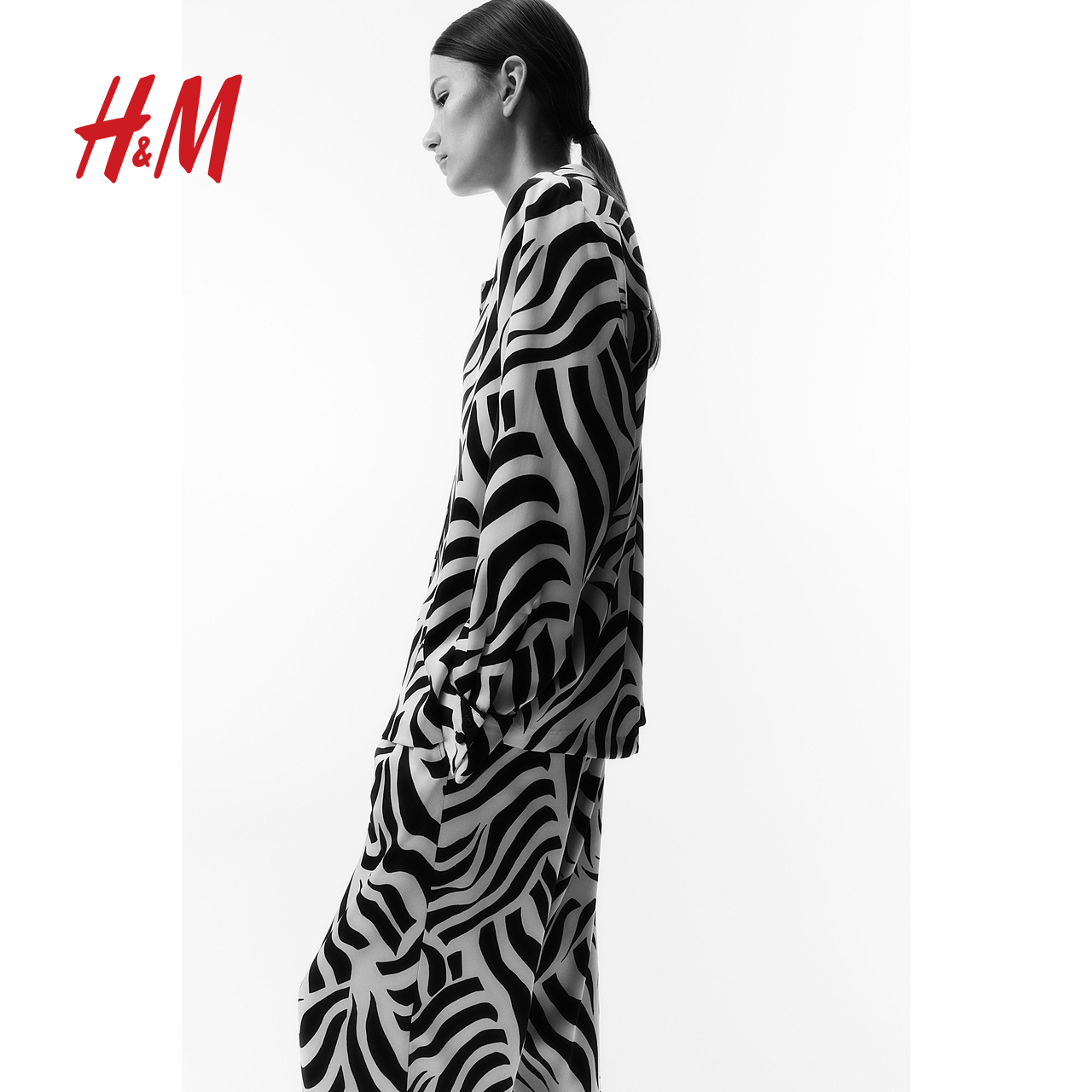 HM女装衬衫秋季时尚翻领内搭斜纹布古巴领长袖上衣1261226