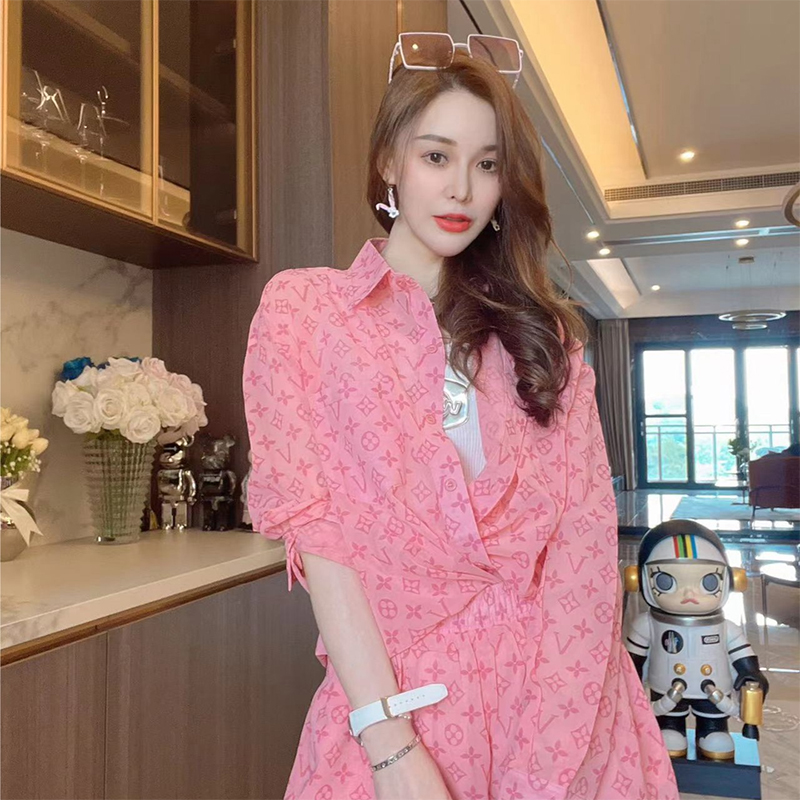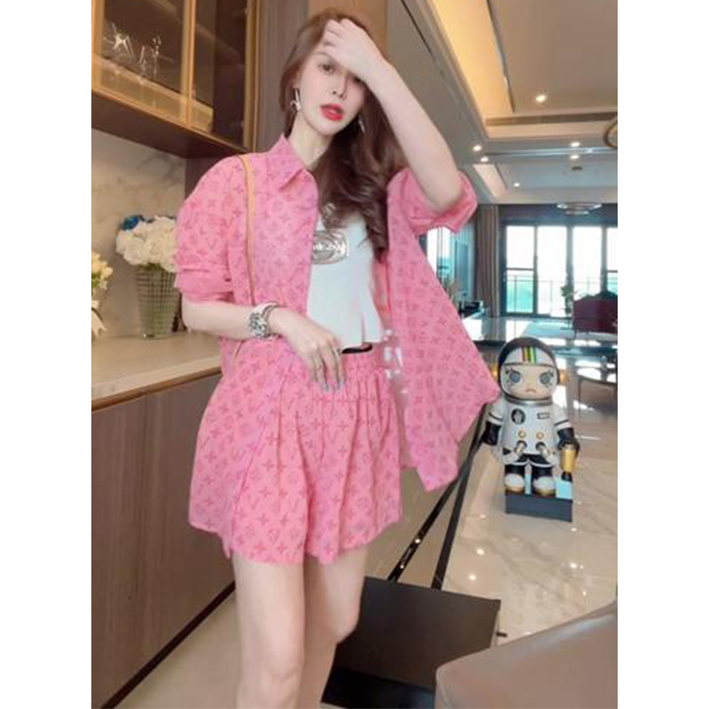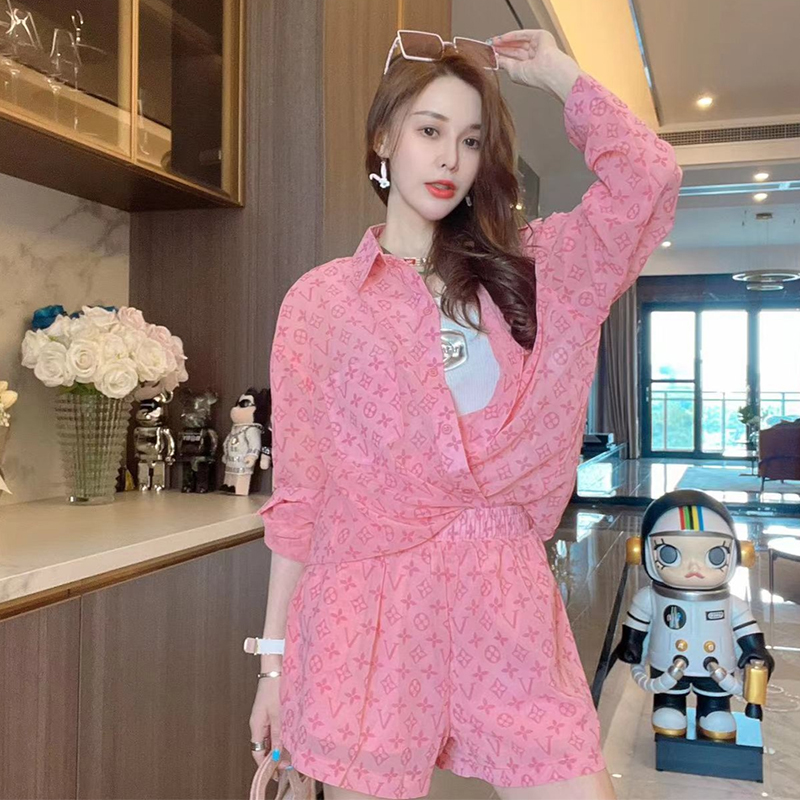 运动套装女2025夏装新款高级感时尚休闲粉色防晒衬衣短裤两件套潮