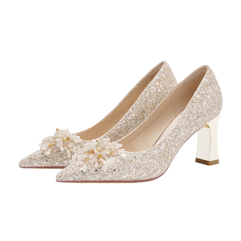 真皮婚鞋女秀禾婚纱两穿不累脚新娘鞋尖头百搭单鞋绝美水晶高跟鞋