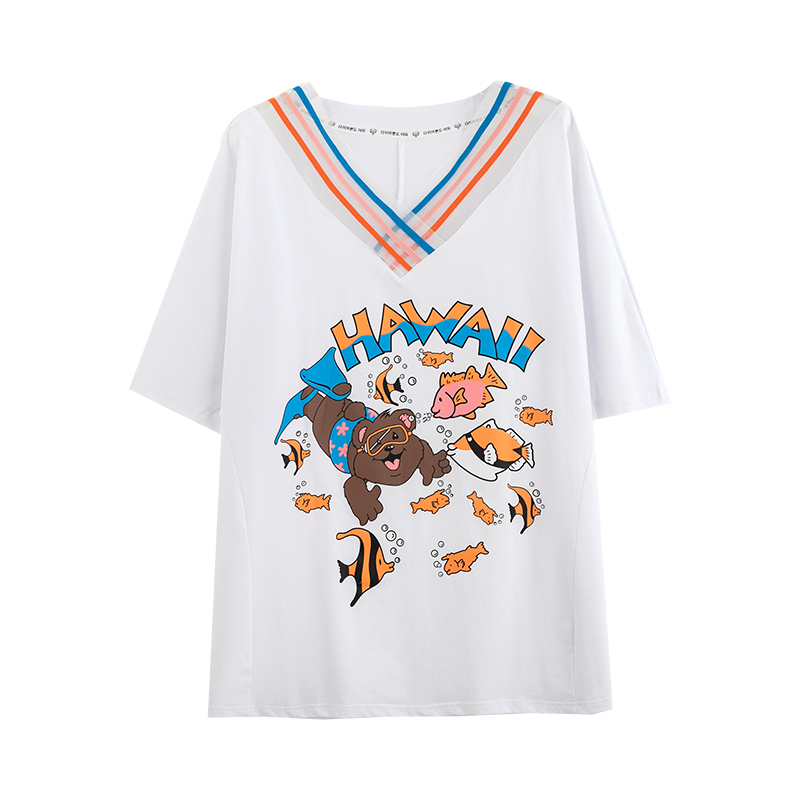 2023夏装新款卡通v领短袖t恤女宽松大码女装胖mm洋气遮肚显瘦上衣