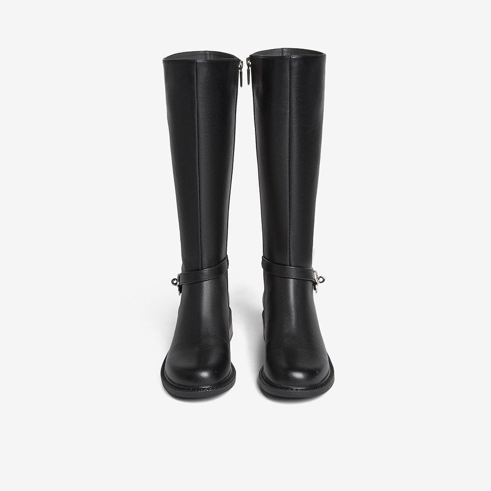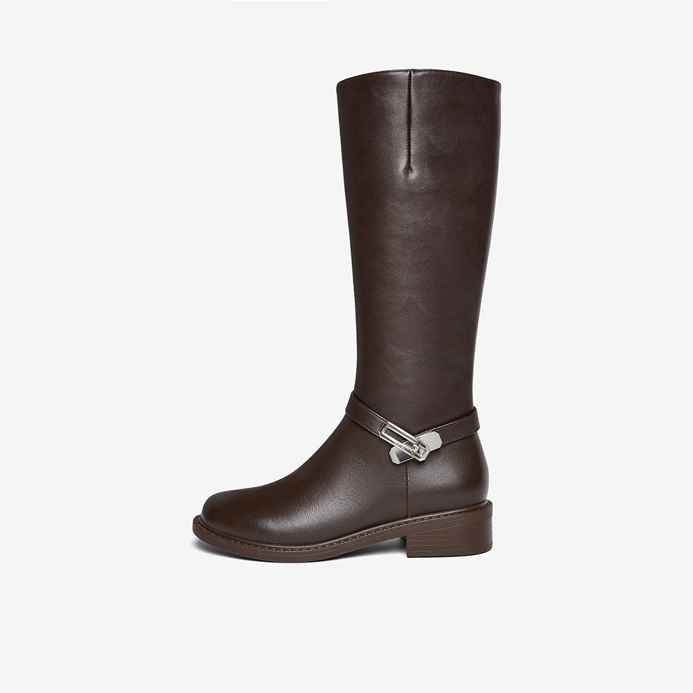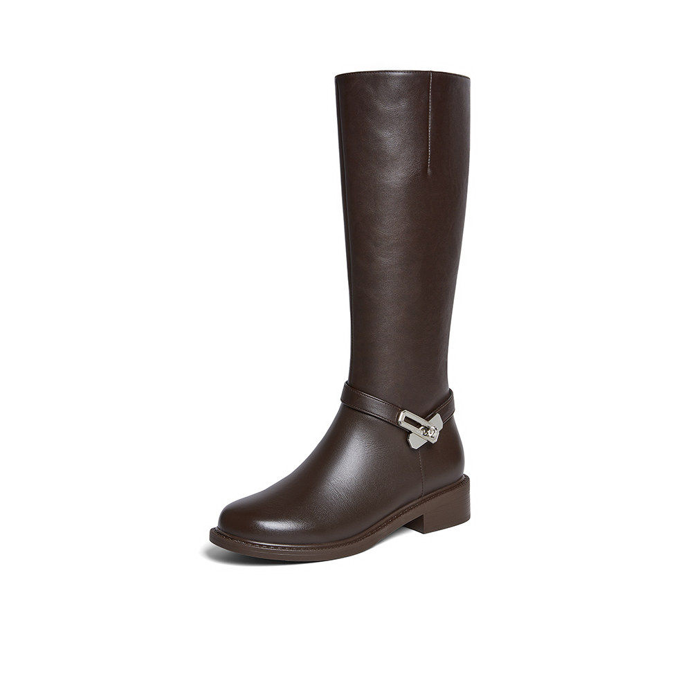 百思图2025冬季新款质感牛皮靴骑士靴通勤加绒高筒女长靴K5131DG5